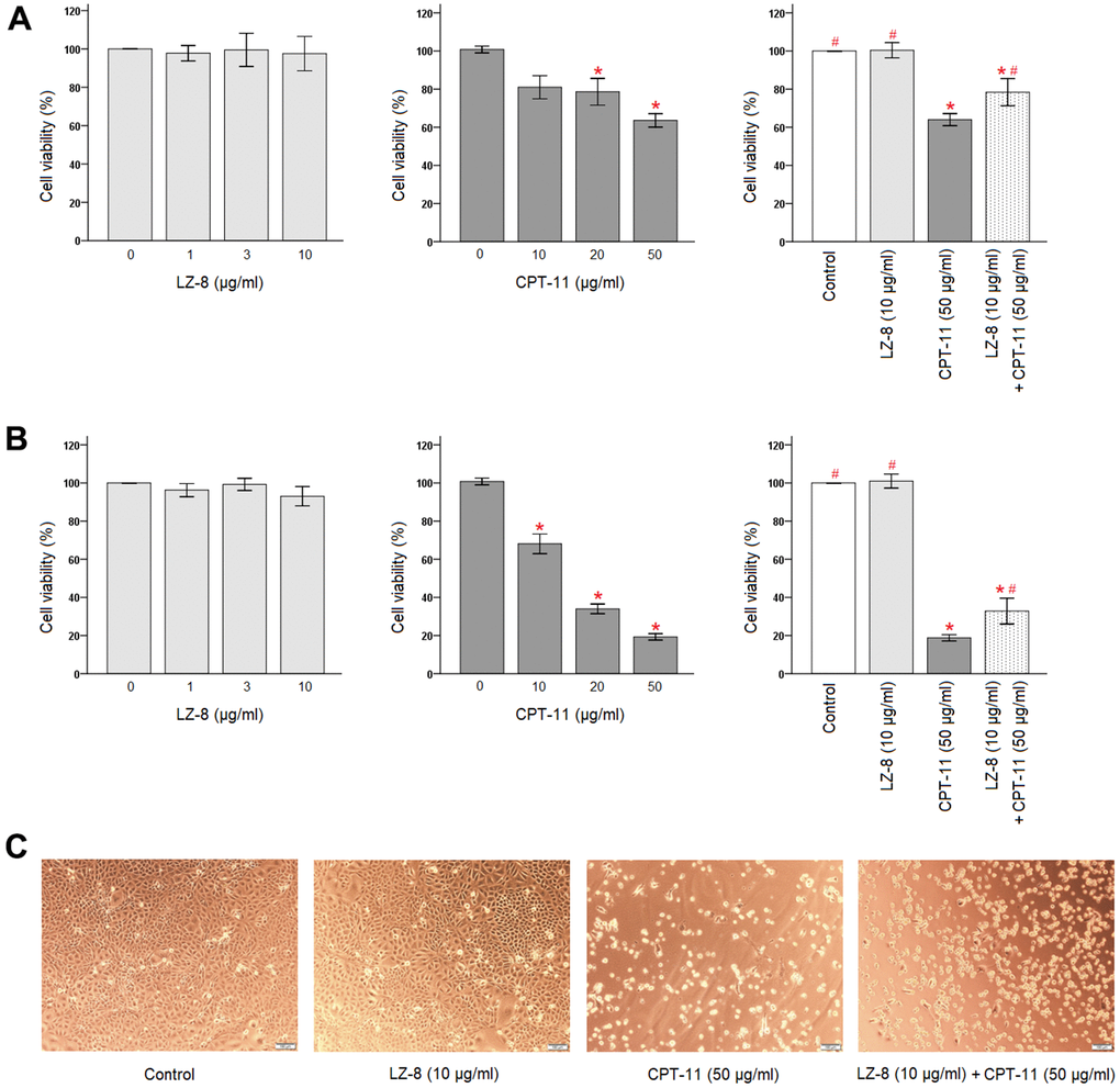 IEC-6 cells were seeded in 96-well plates at a density of 4 × 103 cell/well and incubated for 24 hours. To investigate cell viability of IEC-6 cells after LZ-8 or CPT-11 treatment, cells were exposed to various concentrations of LZ-8 (1, 3, and 10 μg/ml) or CPT-11 (10, 20, and 50 μg/ml) for 24 or 48 hours. Then, CCK-8 reagent (Sigma-Aldrich, St. Louis, MO, USA) was added to each well followed by incubation for a period of 2 hours at 37° C. The absorbance was measured by spectrophotometry (BioTek Instruments, Santa Clara, CA, USA) at 450 nm. For control, the absorbance of untreated cells was considered 100%.
