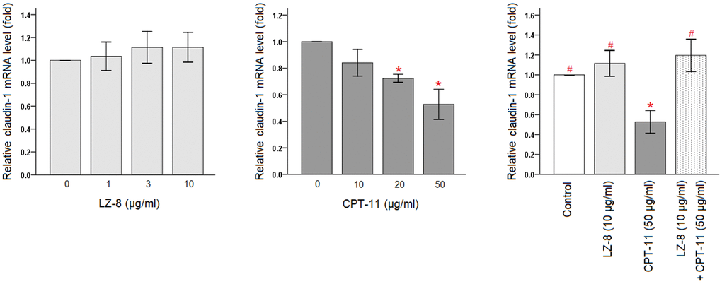 As tight junctions are essential to maintain intestinal barrier integrity, qPCR and Western blotting were used to determine the expression of claudin-1 in IEC-6 cells following different treatments. As above, IEC-6 cells were exposed to various concentrations of LZ-8 or CPT-11 for 24 hours. To assess the influence of LZ-8 pretreatment on CPT-11-induced damage, IEC-6 cells were treated with 10 μg/ml LZ-8 for 24 hours and subsequent 50 μg/ml CPT-11 for 24 hours. After indicated treatments, the cells were harvested for further experiments.