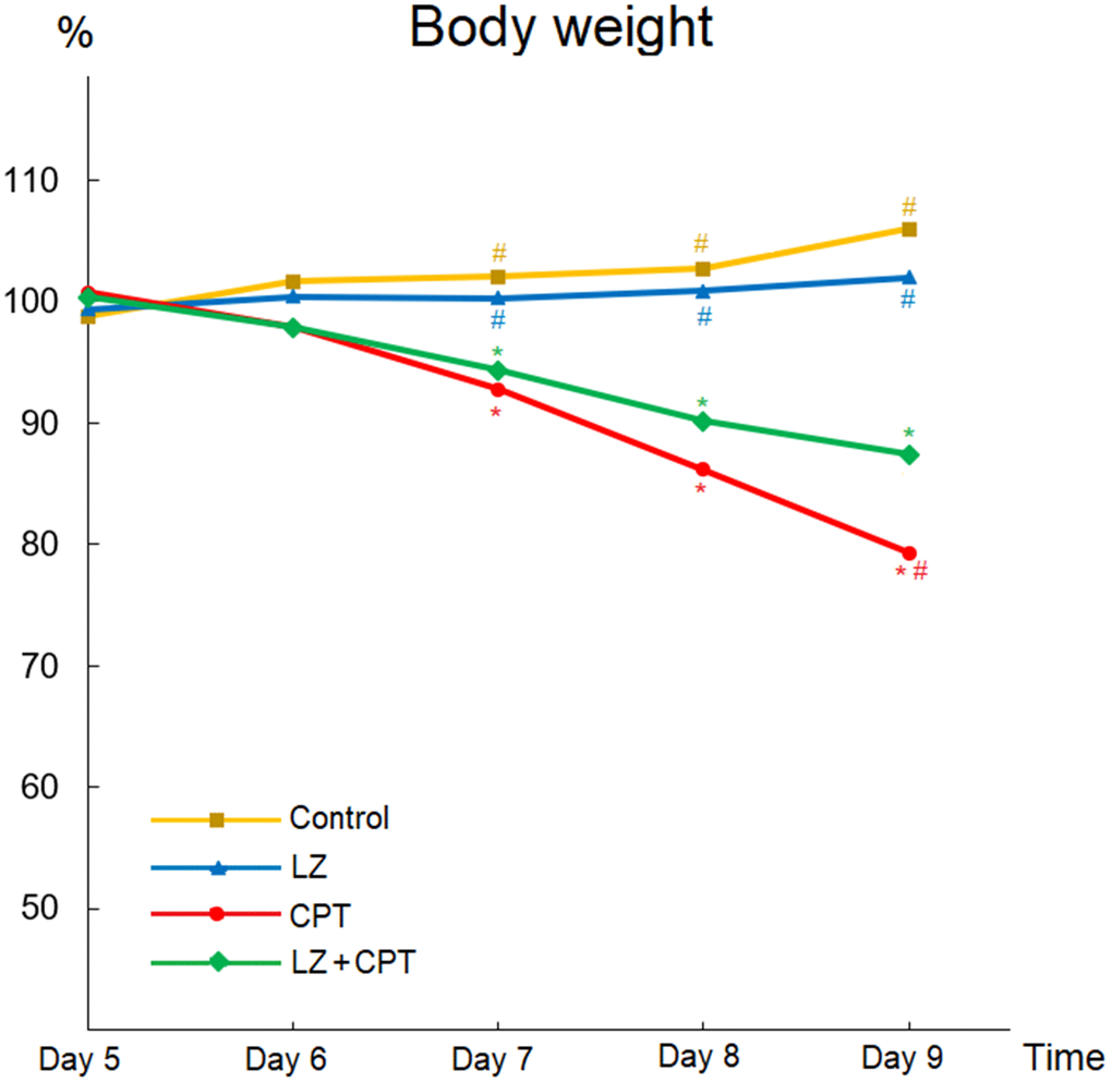 During the first four days, mice of the LZ and LZ+CPT groups were fed with LZ-8 and mice of the control and CPT groups received oral phosphate-buffered saline (PBS) as controls. Mice in all four groups shared similar general conditions, including food intake and activity. Normal feces conditions were observed in all mice, and no obvious difference in body weight gain was noted between the groups. These results suggested that short-term use of LZ-8 did not have significant impact on the mice.
