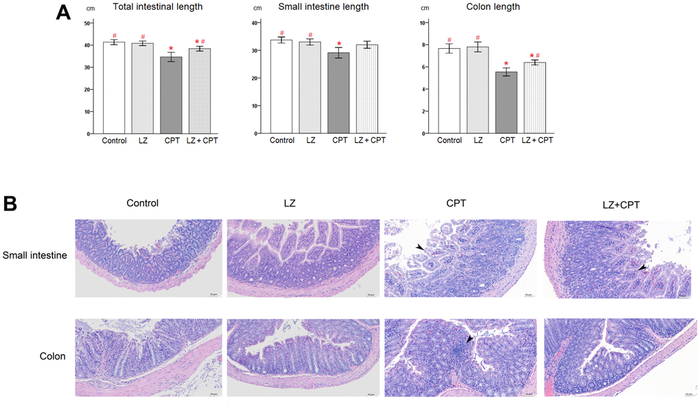 As a strong correlation of length reduction with murine intestinal injury, intestinal lengths were measured immediately after sacrifice. Compared to the control group, no obvious changes of the intestinal lengths were observed in mice of the LZ group (Figure 5A). On the other hand, total lengths of the intestine shortened significantly in mice of the CPT group (P = 0.003). The significant shortening of lengths in the CPT group can be observed in both small intestine and colon (P = 0.012 and P < 0.001, respectively). It is worth to note that the reduction in intestinal lengths was ameliorated in mice of the LZ+CPT group, compared to the CPT group. The influence of LZ treatment was more evident on the lengths of the total intestine and colon (P = 0.045 and P = 0.013, respectively).
