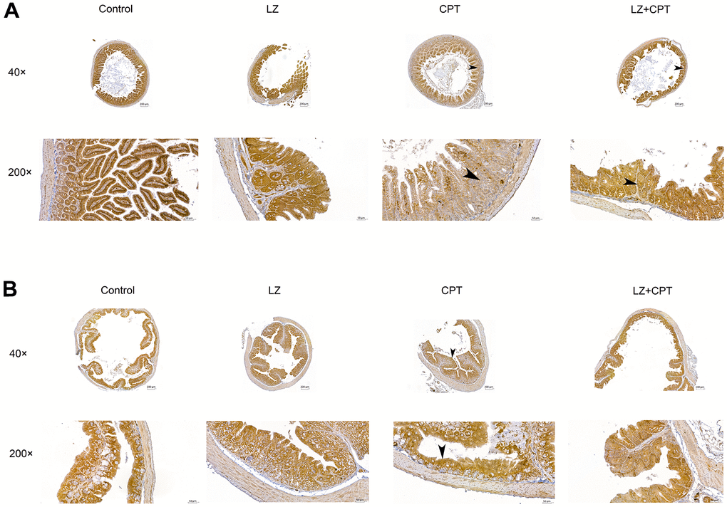 Hematoxylin and eosin staining revealed normal architecture of the small intestine and colon in the control and LZ groups (Figure 5B). On the contrary, several histopathologic changes indicating intestinal injury were found in the CPT group, including rupture of epithelial cells, goblet cell depletion, irregularly arranged glands, edema, and infiltration of inflammatory cells into the lamina propria. The alterations were more significant in the small intestine than in the colon. Notably, the histopathologic alterations in both small intestine and colon were attenuate in mice of the LZ+CPT group, compared to the CPT group.