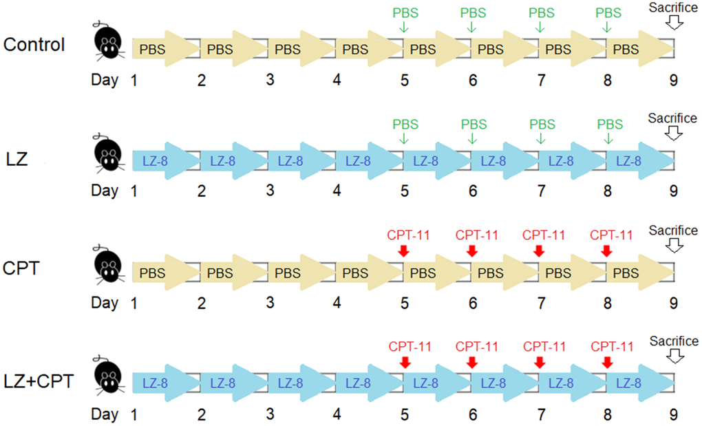 Eight-week-old female Balb/c mice weighing 20 ± 2 g were obtained from the National Laboratory Animal Center (Taipei, Taiwan) and maintained in a temperature- and humidity-controlled environment with free access to food and water in the Laboratory Animal Center of the Chung Shan Medical University. Mice were randomly divided into four groups with five mice in each group (Figure 7). 50 μg LZ-8 in 100 μL of PBS was given to mice of the LZ and LZ+CPT groups through gavage once a day for 8 days. Mice of the control and CPT groups were daily fed with PBS (100 μL) for control. To induce intestinal injury, mice of the CPT and LZ+CPT groups received intraperitoneally injections of CPT-11 (75 mg/kg) for 4 consecutive days, starting from day 5 to day 8. Mice of the control and LZ groups were injected with PBS at the same time points for control.