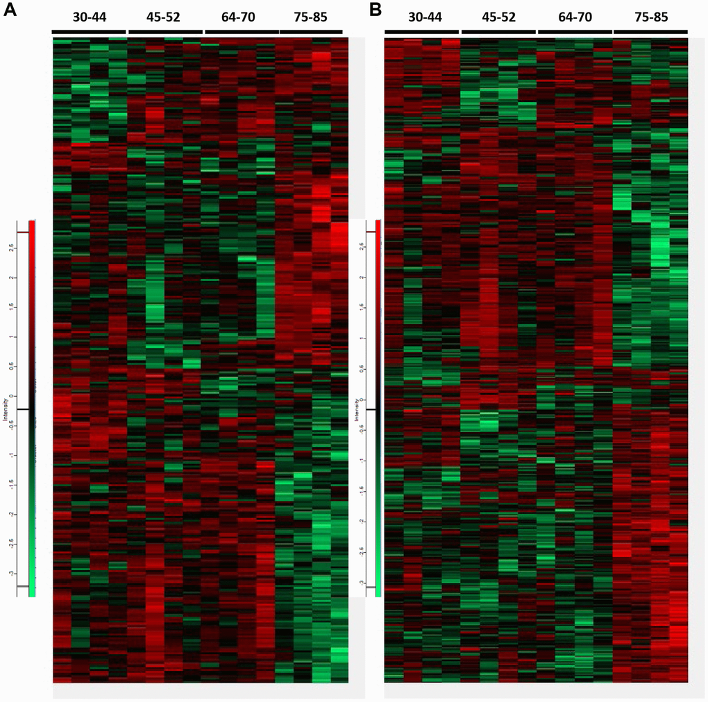 Heatmaps of proteomes and phosphoproteomes showed marked differences in the FC across age groups. A total of 2,830 proteins and 6,722 phosphopeptides were quantified. 308 differential expressed proteins and 465 differential phosphopeptides (306 proteins) were identified when comparing all age groups using the ANOVA one-way test (p < 0.05; Fold Change > 30%) (Figure 1). Two hundred eighty differentially expressed proteins and 278 phosphopeptides were familiar to the four groups (p < 0.05). Protein levels and the direction of hyper- or hypo-phosphorylation were variable in every age group. Some phosphoproteins showed more than one phosphorylation site; the direction of phosphorylation varied in every phosphosite. Only 28 deregulated phosphoproteins also showed altered total expression levels. These numbers indicate that only a tiny percentage of deregulated phosphoproteins might correspond to abnormal expression levels of the corresponding protein.