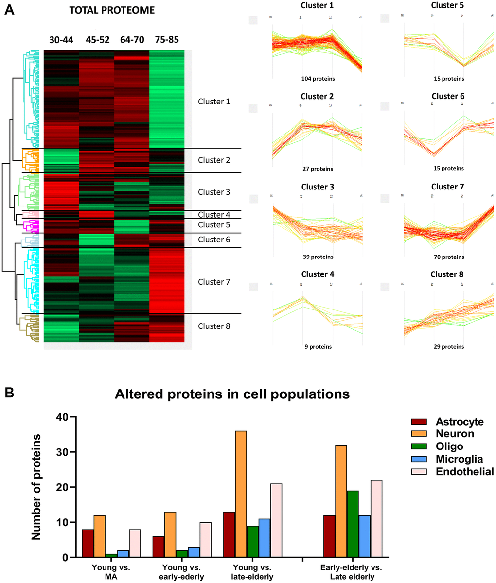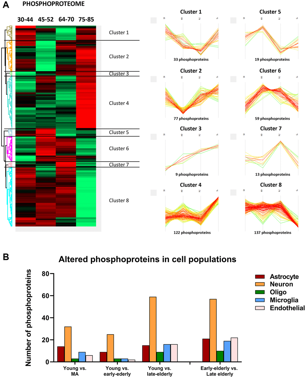 Then, deregulated proteins and phosphoproteins were categorized into eight clusters based on their age-dependent expression similarity. Interestingly, protein and phosphoprotein levels of the larger hierarchical clusters were stable until the age of 70 years. After this age, the late-elderly group showed decreased or increased expression of the two major protein clusters, 1 and 7, respectively (Figure 3A). Similarly, major phosphorylation modifications occurred in the late-elderly group in clusters 4 and 8 (Figure 4A). Proteins and phosphoproteins composing every cluster are detailed in the Supplementary Table 1.