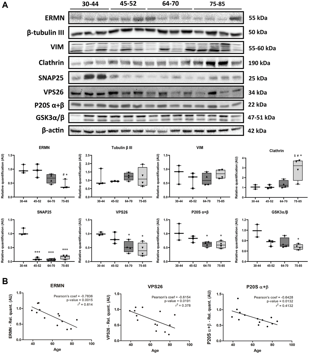 ERMN, VPS26, and P20S α + β protein levels were correlated with age (p = 0.0015, p = 0.0191 and p = 0.0132, respectively) (Figure 6B). The small number of cases per group (even lower than the number used for phosphoproteomics) does not permit robust conclusions. Antibodies directed against deregulated phosphoproteins identified in the present study were not available. Therefore, no attempt was made to validate (phospho)proteomics observations.