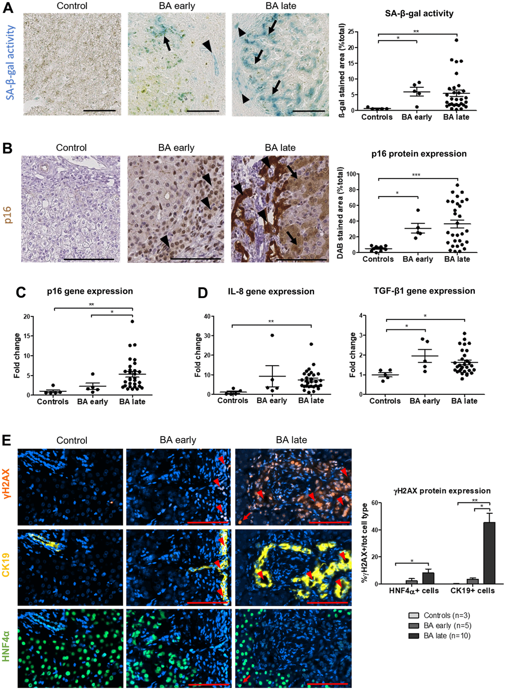 Senescence was evidenced in BA through multiple markers and techniques, including SA-β-gal activity, p16 protein and gene expression, γH2AX protein expression and SASP markers gene expression elevation (IL-8 and TGF-β1) (Figure 1A–1D and Supplementary Figure 2B). Of note, p16 and IL-8 gene expression significantly increased only in late stage BA (Figure 1C, 1D). Advanced premature senescence was already present in the BA early group, as suggested by an increased protein expression of p16 but not p21, p16 being described as a late marker of senescence (Figure 1B and Supplementary Figure 2A) [21]. However, there was still a clear progression of senescence between the time of diagnosis and liver transplantation (Figure 1C, 1E). Interestingly, senescence development was correlated to disease progression (Supplementary Figure 1B, 1C). Senescence was predominant in cholangiocytes and also present in surrounding perinodular hepatocytes (Figures 1A, 1B, 1E, 2). When we investigated the telomeric DNA damages in late stage BA, γH2AX-positive DNA damage foci were evenly distributed in the whole DNA sequence without any specific accumulation in telomeres (Supplementary Figure 2C). However, the absolute increase in the number of telomere damage foci might per se induce senescence in the affected cells [2].