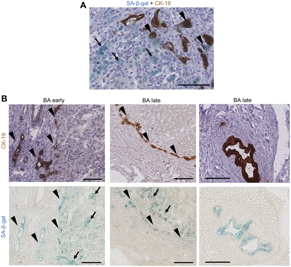 Our results show that premature senescence was already advanced at diagnosis in BA and continued to progress until liver transplantation. Senescence was predominant in cholangiocytes and perinodular hepatocytes, corroborating the hypothesis of a paracrine transmission of senescence through elevated SASP markers.
