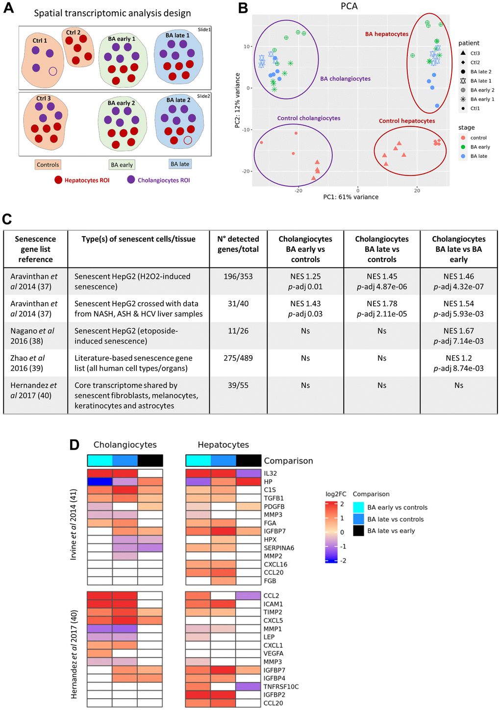To further assess the localization and progression of cellular senescence, we performed a digital spatial whole transcriptomic analysis on BA and control liver samples. Both cholangiocytes and hepatocytes regions of interest (ROI) were selected in BA early, BA late and control livers (Figure 3A). Principal component analysis (PCA) revealed that the transcriptomes differed according to cell type (cholangiocytes versus hepatocytes) and disease stage (Figure 3B). Early and late stage BA transcriptomes were clustered together and differed from controls for each cell type. Differential expression analysis was performed between disease stages subgroups for each cell type and data is available for the main differentially expressed genes in Supplementary Figure 3. Gene ontology (GO) enrichment analysis of biological processes (MSigDB Collection: C5 GO BP) and hallmark gene sets enrichment analysis (MSigDB Collection: H) were also performed on our dataset (Supplementary Figure 4). GO terms that appeared to be the most significant when comparing genes differentially expressed between diseased cholangiocytes versus controls corresponded to “supramolecular fiber organization”, “cell adhesion” and “ion transport” categories, in line with the disruption of apical-basal polarization described in BA cholangiocytes [22].
