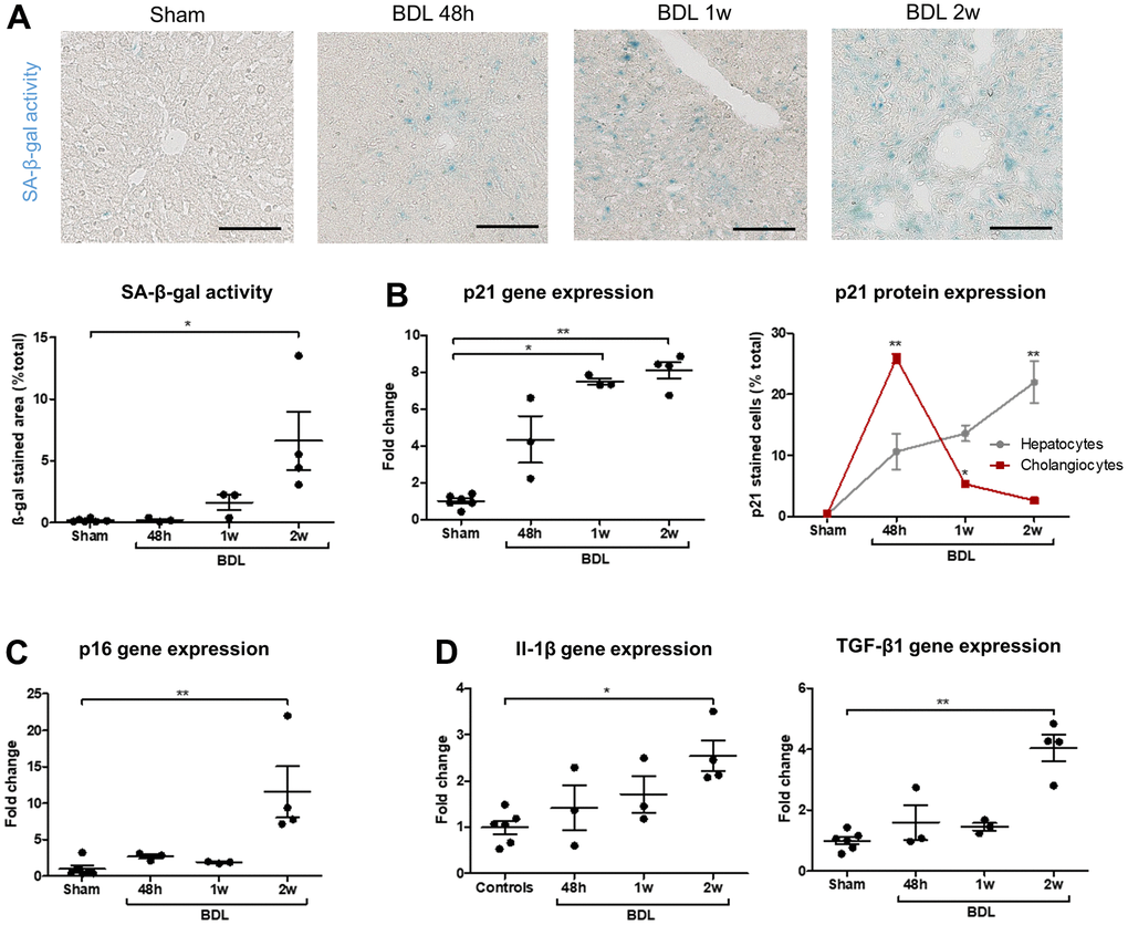 Our results confirm that BDL is a robust model of biliary senescence. Studying early post-surgical stages allowed us to demonstrate that senescence (p21-positive cells) developed first in cholangiocytes and subsequently in hepatocytes during biliary injury.
