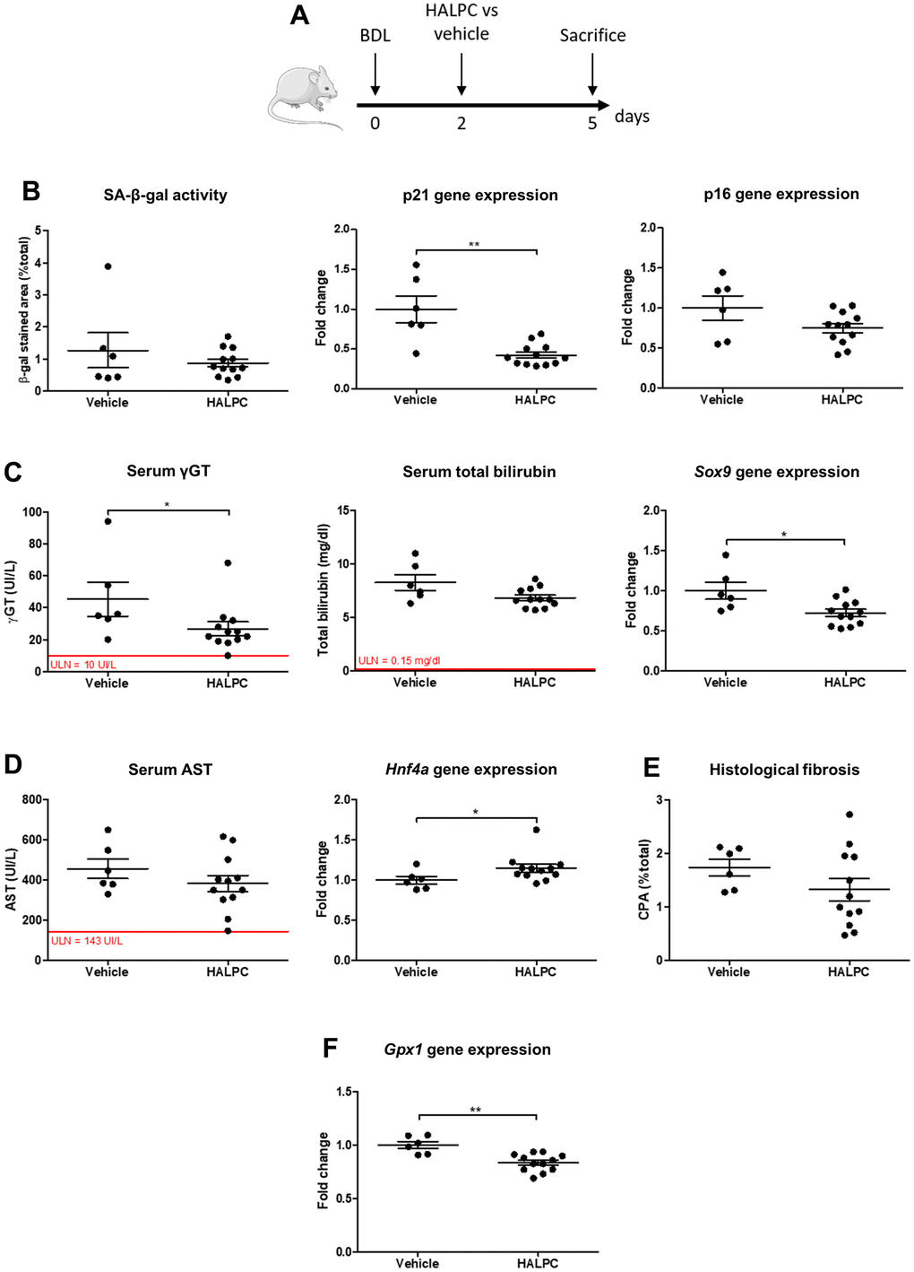In conclusion, BA livers displayed advanced senescence at diagnosis and senescence and SASP continued to progress until liver transplantation. HALPC but not D+Q reduced early senescence and improved liver disease in a preclinical model of biliary cirrhosis, providing encouraging preliminary results. However, the development of therapeutic agents that target selected senescent cell-types through clearly identified mechanisms and thereby improve established senescence and liver disease will be needed before considering to translate senotherapies to pediatric biliary cirrhosis.