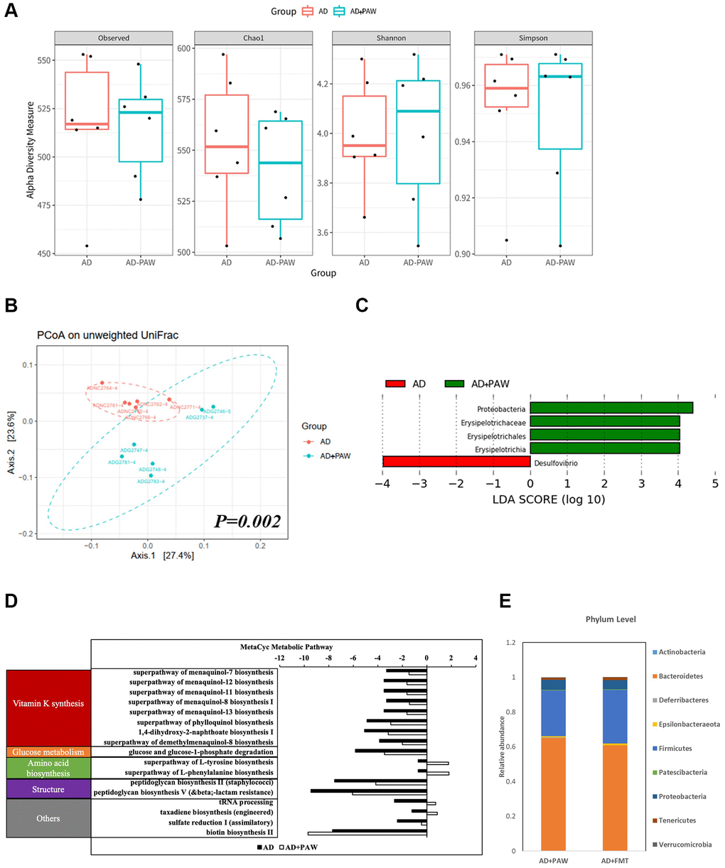 The gut microbiota (GM) of wild-type (WT) and APPswe/PS1dE9 mice (AD mice) was differed from each other (Supplementary Figure 1). The alpha diversity of the GM of PAW-fed AD mice (AD+PAW mice) were not significantly different from those of regular water-fed AD mice (AD mice) (Figure 1A). This result indicates that PAW does not cause significant changes in the enrichment of gut microbiota. In beta diversity, Unweighted UniFrac principal component analysis (PCoA) showed that AD+PAW mice displayed a different fecal microbiome profile (p-value = 0.002) than regular AD mice (Figure 1B). This result suggests that PAW causes changes in gut microbiota composition and there was a statistically significant difference between the two groups. The results of a taxonomic analysis of the microbiota showed that the genera Desulfovibrio decreased and the family Erysipelotrichaceae, phylum Proteobacteria increased in AD+PAW mice (Figure 1C). Similar profiles also observed in comparison of WT with AD mice (Supplementary Table 1). In addition, we further predicted the functional capacity of the gut microbiota by using inference based on 16S rRNA gene amplicon sequences (PICRUSt2). The relative abundance of all predicted pathways suggested major differences in the functional potential of the microbiota between AD and AD+PAW mice. The functions were grouped into vitamin K synthesis, glucose metabolism, amino acid biosynthesis, structure, and others. Most abundant microbiota in these groups was vitamin k synthesis (Figure 1D). Furthermore, to further confirm the microbiota profile was altered by PAW, we collected stools from AD+PAW mice for fecal microbiota transplantation (AD+FMT mice). We collected subjected those samples to 16S rRNA next-generation sequencing (NGS). The results showed that bacteria taxonomy had high similarities and abundances between AD+PAW and AD+FMT mice (Figure 1E). PAW treatment also produced a similar profile, including Desulfovibrionaceae_ge, Desulfovibrio, Erysipelatoclostridium, Candidatus_Stoquefichus, Allobaculum, Ruminococcus_1, Akkermansia, Mucispirillum, Lachnospiraceae_FCS020_group, Tyzzerella, and Helicobacter, in WT mice compared to the AD model (Supplementary Table 2). These results suggested that AD+FMT mice could stably colonize the gut microbiota from AD+PAW mice.