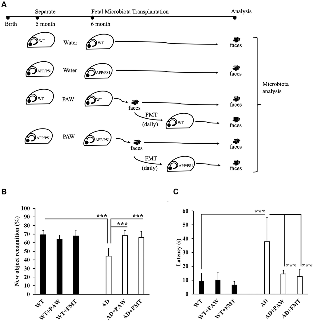 To test the effects of PAW and FMT from PAW AD mice on the amelioration of memory decline, we prepared AD and wildtype (WT) mice to be fed PAW (WT+PAW, AD+PAW), FMT (WT+FMT, AD+FMT), and regular water (WT, AD) from 5 to 16 months of age (Figure 2A). The NOR index of AD mice decreased from 69% to 44% compared to WT mice according to an NOR assay. The AD+PAW and AD+FMT mice exhibited a resurgence in the recognition index from 44% to 68% and 66%, respectively, which were levels like those of WT mice. No significant differences were observed in WT, WT+PAW, or WT+FMT mice (Figure 2B). In the Morris water maze assay, AD mice showed significantly prolonged latency at 38 s compared to 10 s for WT mice. The AD+PAW mice showed significant reductions in latency to 15 and 13 s, respectively, which were similar to values for WT mice. No significant differences were observed among WT, WT+PAW, or WT+FMT mice (Figure 2C). These results showed that PAW and FMT might reverse the AD symptoms in AD mice.