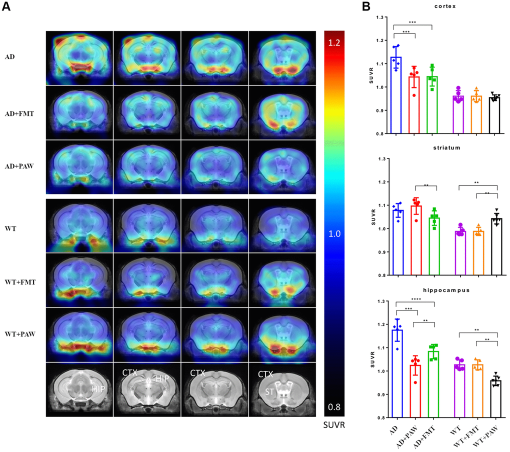 To explore the mechanisms of the rescue of memory declines in AD+FMT mice, we conducted amyloid PET to measure changes in amyloid accumulation in the brains of wildtype (WT) and AD mice fed with water (WT, AD), PAW (WT+PAW, AD+PAW) and FMT (WT+FMT, AD+FMT). Intense and diffusely increased uptake of radioactivity was observed in the cortex and hippocampus of AD mice. The AD+PAW and AD+FMT mice exhibited significantly reduced uptake of radioactivity in the cortex and hippocampus compared to AD mice (Figure 3A, 3B). The standardized uptake value (SUV) ratios (SUVRs) in the cerebellum (SUVRcer) of each brain region are shown in Supplementary Table 3. These results suggest that PAW and FMT experienced a reduction of amyloid accumulation in the brain of AD mice.