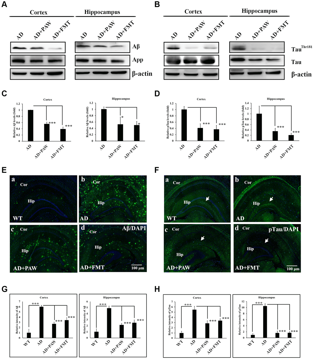 Aβ and p-tau burdens decreased in the cortex and hippocampus of FMT- and PAW-fed AD mice