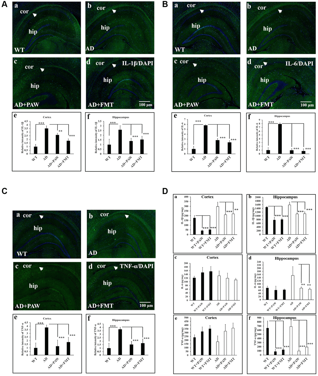 Inflammation is generally detected in the pathologically vulnerable regions of AD patients. We analyzed the protein levels of inflammatory markers in the cortex and hippocampus of AD mice by IF staining and an enzyme-linked immunosorbent assay (ELISA). The protein levels of IL-1β (Figure 5A), IL-6 (Figure 5B), and TNF-α (Figure 5C) were significantly increased in AD mice (Figure 5Ab, 5Bb, 5Cb, 5Ae, 5Af, 5Be, 5Bf, 5Ce, 5Cf) and decreased in PAW-fed (AD+PAW) (Figure 5Ac, 5Bc, 5Cc, 5Ae, 5Af, 5Be, 5Bf, 5Ce, 5Cf) and FMT (AD+FMT) (Figure 5Ad, 5Bd, 5Cd, 5Ae, 5Af, 5Be, 5Bf, 5Ce, 5Cf) AD mice compared to water-fed AD mice (Figure 5Aa, 5Ba, 5Ca, 5Ae, 5Af, 5Be, 5Cf, 5Ce, 5Cf), as measured by an IF staining assay (Figure 5A–5C). Further analysis of the protein levels of IL-1β, IL-6, and TNF-α in the hippocampus of AD mice by ELISA revealed a reduction in protein levels in AD+PAW and AD+FMT mice compared to water-fed AD mice (Figure 5Db, 5Dd, 5Df). In the cortex, the IL-1β protein concentration was reduced in AD+PAW and AD+FMT mice (Figure 5Da). The protein levels of IL-6 (Figure 5Dc), and TNF-α (Figure 5De) in the cortex were not changed. Protein levels of inflammatory markers measured by ELISA are shown in Supplementary Table 4. These results suggest that PAW and FMT can possibly reduce inflammation in the hippocampus of AD mice.