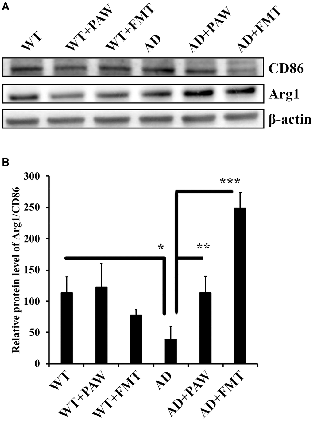Neuroinflammation induced by hypoxia activates M1 microglia and reduces M2 microglia by determining CD86 and Arginase-1 expression in Alzheimer’s disease [43]. To investigate the effects of PAW and FMT-induced microbiota alterations on neuroinflammation in AD mice, we analyzed the marker protein levels of M1 (CD86) and M2 (Arginase-1) microglia in brain tissue. The M2/M1 ratio was reduced in AD mice, but it was reversed in AD mice fed with PAW (AD+PAW) or subjected to FMT (AD+FMT) AD mice (Figure 6A, 6B). These findings suggest that PAW and FMT have the potential to reverse neuroinflammation in AD mice.