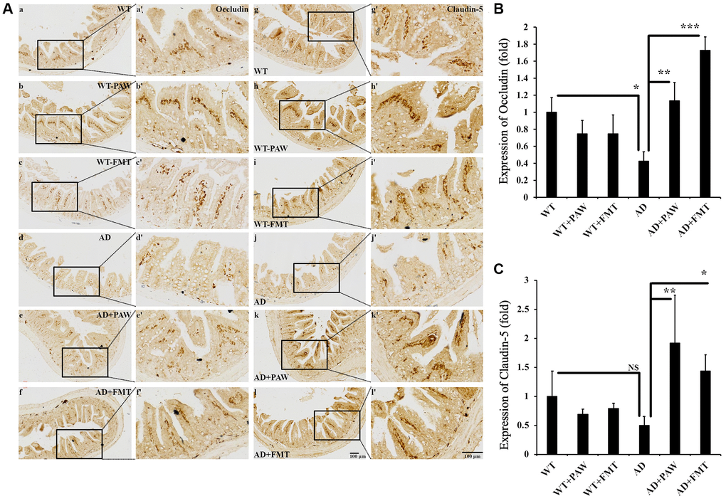 Alzheimer’s disease has been reported to correlate with breakdown of gut epithelial barrier integrity, increased permeability due to dysbiosis-induced changes in gut microbiota, and neuroinflammation-induced symptoms [44]. To analyze the epithelial barrier integrity in PAW-fed and FMT AD mice, we conducted immunohistochemical analysis to measure the levels of occludin and claudin-5 [45, 46], which are known markers of gut epithelial integrity. The levels of occludin protein were found to be decreased in AD mice compared to WT mice (Figure 7A, 7B), but they were reversed in AD mice fed with PAW (AD+PAW) or subjected to FMT (AD+FMT) (Figure 7Aa–f, a’–f’, 7B). The levels of claudin-5 protein were also decreased in AD mice compared to WT mice, but this finding did not reach statistical significance. In AD mice fed with PAW (AD+PAW) or subjected to FMT (AD+FMT), the levels of claudin-5 protein were significantly increased compared with those in AD mice (Figure 7Ag–7l, 7g’–7l’, 7C). These results suggest that PAW and FMT may increase the gut epithelial barrier integrity in AD mice.