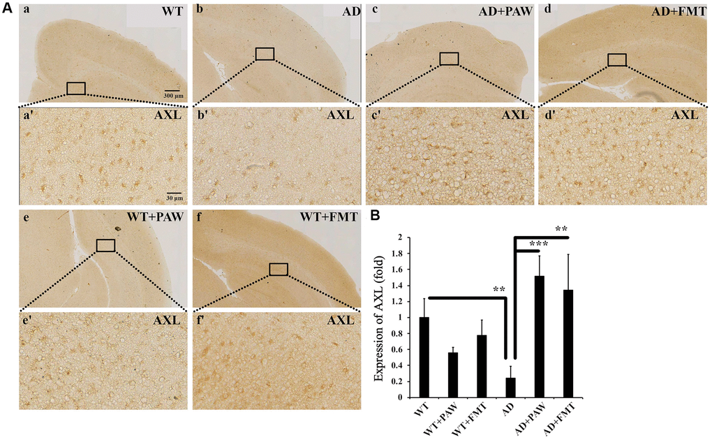 In earlier reports, vitamin K deficiency was found to contribute to the pathogenesis of Alzheimer’s disease, and supplementation with vitamin K might have a beneficial effect on prevention or treatment [47, 48]. Vitamin K was shown to activate the AXL pathway and reduce neuroinflammation in the brain [49, 50]. In our present study, microbiota profiles were altered by PAW and FMT to group functions on vitamin K synthesis. To further analyze the activation of AXL by PAW and FMT in AD mice, the protein levels of AXL in the brain were measured by immunohistochemistry. The protein levels of AXL were reduced in AD mice (Figure 8Ab, 8b’, 8B) compared to WT mice (Figure 8Aa, 8a’, 8B) but they were reversed in PAW-fed (AD+PAW) (Figure 8Ac, 8c’, 8B) and FMT (AD+FMT) AD mice (Figure 8Ad, 8d’, 8B). There was no significant difference in AXL protein expression between PAW-fed (WT+PAW) mice (Figure 8Ae, 8e’, 8B) and FMT (WT+FMT) mice (Figure 8Af, 8f’, 8B) compared to WT mice (Figure 8Aa, 8a’, 8B). These results suggest that AXL expression might be activated in the brain of PAW-fed and FMT AD mice.