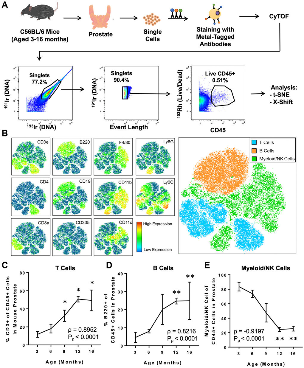 Next, we used CyTOF to characterize age-related changes in the immune microenvironment of the prostate throughout adulthood. Prostates were isolated from adult mice aged 3, 6, 9, 12, and 16 months (each n = 4), and dissociated cells were stained with a panel of 19 metal-tagged antibodies designed to label a broad variety of immune cell types using CyTOF (Table 1 and Figure 1A). Immune cells from all ages were clustered using the t-distributed stochastic neighbor embedding (t-SNE) algorithm for dimensional reduction and visualization (Figure 1A, 1B and Supplementary Figure 2A). Based on expression of well-defined immune cell lineage markers, the t-SNE plot was separated into 3 broad groups: T cells (expressing CD3e), B cells (expressing B220), and myeloid/NK cells (expressing CD335, F4/80, CD11b, CD11c, Ly6C, or Ly6G) (Figure 1B). We observed a positive correlation between age and the percentage of T cells (ρ = 0.8952, Pρ < 0.0001) and B cells (ρ = 0.8216, Pρ < 0.0001) in the adult mouse prostate (Figure 1C, 1D). The enrichment for T and B lymphocytes with age was accompanied by a respective decrease in the percentage of myeloid/NK cells (ρ = –0.9197, Pρ < 0.0001) in the aging mouse prostate (Figure 1E). These trends are consistent with the age-related increase in T and B lymphocytes and decrease in myeloid and NK cells previously reported in 3- and 24-month-old mouse prostates by our group [12].