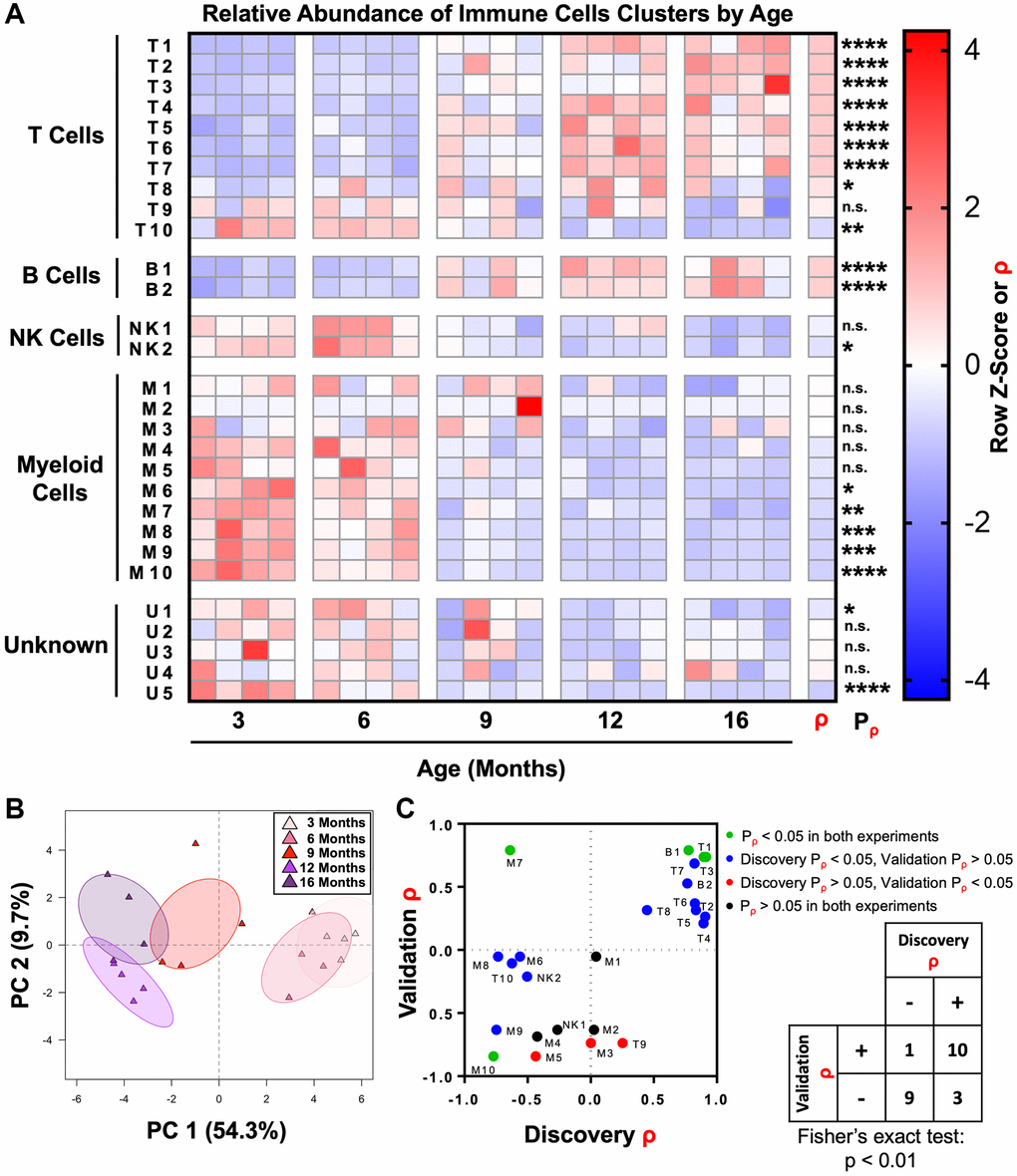 Comparisons between ages were made using the non- parametric Kruskal-Wallis H test followed by Dunn’s multiple comparisons test against the 3-month-old samples, using adjusted p-values to account for multiple comparisons. Kruskal-Wallis and two-way ANOVA were used to evaluate differences in immune lineage markers between immune cell clusters. Fisher’s exact test was used to compare the direction of correlation with age (ρ > 0 or ρ < 0) for immune cell clusters between the discovery and validation experiments. Mann Whitney U test was used to compare immune cell cluster frequencies at 3- and 16-months-old for each tissue. Number of replicates (n) and type of replicate are listed in the figure legends. Error bars represent SD. *p < 0.05, **p < 0.01, ***p < 0.001, ****p < 0.0001. n.s., not significant, p ≥ 0.05.