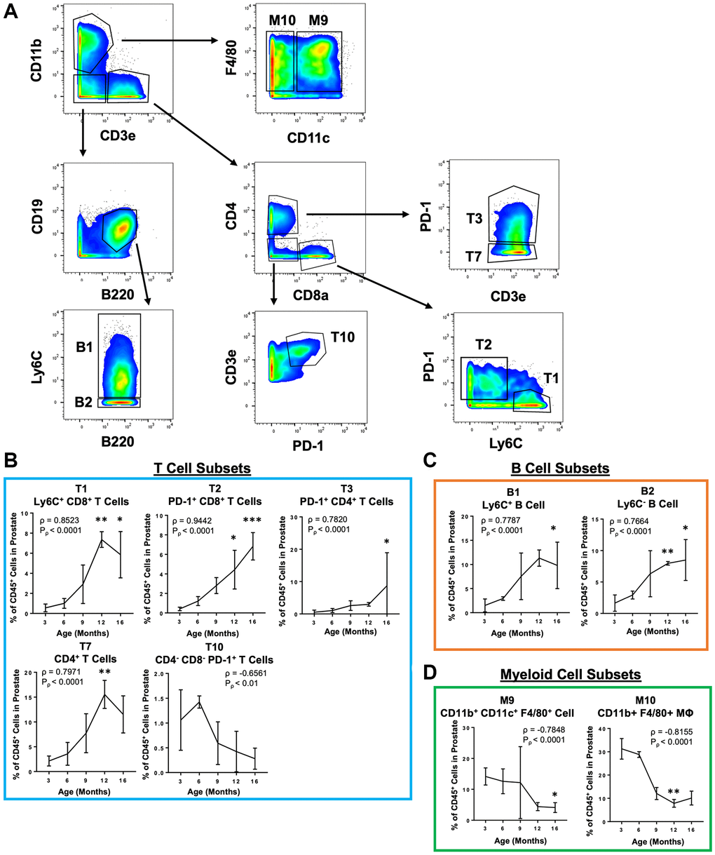 Prostates from mice of various ages between 1 and 16 months were collected and weighed to confirm the relationship between age and prostate development. We observed a positive correlation between age and wet prostate weight (ρ = 0.6673, Pρ < 0.001) with a rapid increase in weight in pre-pubescent mice (<3 months old) (Supplementary Figure 1A), consistent with the rapid, androgen-dependent growth of the prostate which occurs postnatally until sexual maturity at 2–3 months of age [24, 25]. After reaching adulthood, the mouse prostate continues to grow at a much slower rate. In post-pubertal adult mice aged 3 to 16 months, we observed a positive correlation between age and prostate weight (ρ = 0.5144, Pρ < 0.01), with a significant increase in mass at 16 months of age (p < 0.05) (Supplementary Figure 1A). Importantly, age was also positively correlated with the percentage of CD45+ immune cells in the prostate as measured by flow cytometry (ρ = 0.7034, Pρ < 0.01) (Supplementary Figure 1B), consistent with age-related prostatic inflammation. The increase in total immune cells in the aged prostate was confirmed by quantifying the total lymphoid area in aged mouse prostates using immunohistochemistry (Supplementary Figure 1C, 1D).