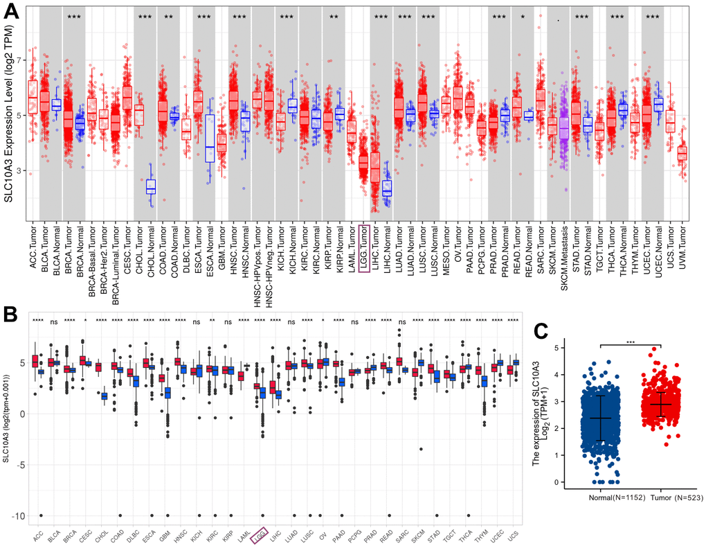We initially mined TIMER database to investigate the expression of SLC10A3 transcription in pan-cancer and LGGs. As displayed in Figure 1A, we found that SLC10A3 is up-regulated in most types of malignant tumors, such as breast cancer, cholangiocarcinoma, esophageal carcinoma, head and neck squamous cell carcinoma, liver cancer, lung cancer, colorectal cancer, gastric cancer. While SLC10A3 is down-regulated in renal cancer, uterine corpus endometrial carcinoma and thyroid carcinoma. Due to the lack of normal brain tissues from TCGA-LGG dataset, we could not know whether there existed the difference of SLC10A3 expression between LGGs and normal brain tissues. Thereby, we further explored the Shiny database, which is mainly based on the TCGA data and GTEx database. In line with the results from TIMER, we still observed that SLC10A3 expression was up-regulated in most malignant tumors, including LGGs (Figure 1B). Next, we downloaded the original gene expression data of TCGA-LGG (N=523) and GTEx (N=1152), and the comparison was also significant (Figure 1C).