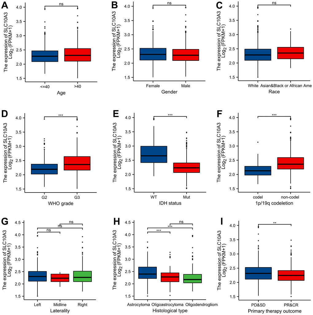 We compared the SLC10A3 mRNA expression in different clinical groups. As exhibited in Figure 2A–2I, we found that SLC10A3 expression was significantly higher in LGGs with G3 (P<0.001), IDH wide type (P<0.001), non-codel 1p19q (P<0.0001), astrocytoma (P<0.001) and progression (P<0.01). Hence, due to the close association between SLC10A3 and worse clinical factors, we inferred that SLC10A3 serves as an oncogene in LGGs.