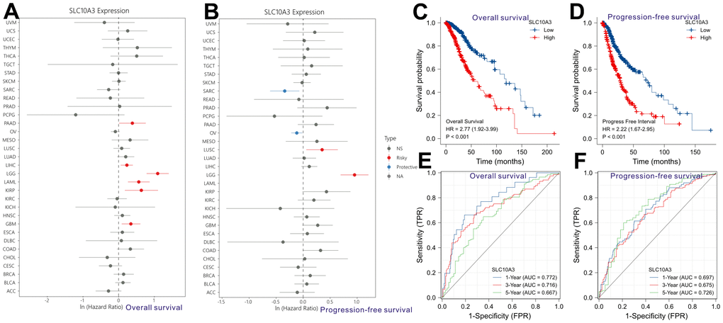 Pan-cancer analysis revealed that up-regulation of SLC10A3 is not only a risk factor for worse overall survival among LGGs (Figure 3A), but also a risk factor for inferior progression-free survival among LGGs (Figure 3B). We classified these LGG individuals into low SLC10A3 group and high SLC10A3 group based on the median expression value of SLC10A3. According to the survival curves, up-regulation of SLC10A3 transcription is remarkably associated with shortened overall survival time compared with down-regulation (HR=2.77, 95%CI:1.92-3.99, P<0.0001, Figure 3C). Similarly, up-regulation of SLC10A3 transcription is remarkably associated with shortened progression-free survival time compared with down-regulation (HR=2.22, 95%CI:1.67-2.95, P<0.0001, Figure 3D). Next, we drew the td-ROC curves to measure the predictive ability of SLC10A3 expression for the 1-year, 3-year and 5-year survival rate of LGG individuals. The expression of SLC10A3 reached good predictive performance for overall survival rate (1-year AUC: 0.772, 3-year AUC:0.716, 5-year AUC:0.667, Figure 3E), and for progression-free survival (1-year AUC: 0.697, 3-year AUC:0.675, 5-year AUC:0.726, Figure 3F).