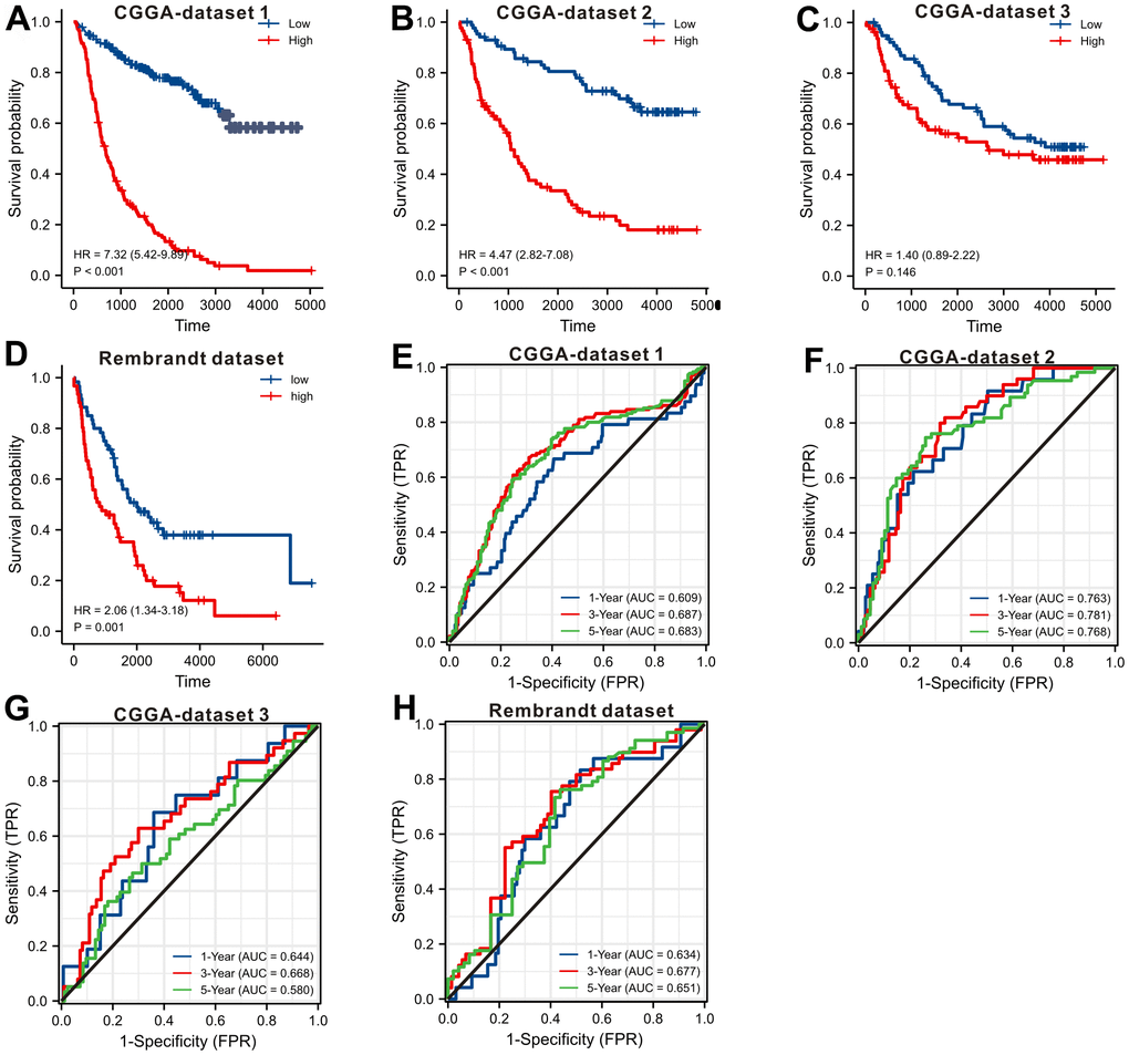 In order to externally confirm the prognostic significance, we also explored the CGGA database and Rembrandt dataset. We downloaded the original gene expression data and only retained the LGGs’ data. The survival curves (Figure 4A–4D) displayed that up-regulation of SLC10A3 in LGGs is also a risk prognostic factor in the four LGG datasets, but the difference was not significant in CGGA dataset 3. So we carried out the meta-analysis via STATA software to confirm whether up-regulation of SLC10A3 transcription is a risk prognostic indicator for LGGs. As listed in Supplementary Figure 1, up-regulation of SLC10A3 transcription is remarkably correlated with less favorable overall survival among LGG population (HR=3.07, 95%CI:1.68-5.63, P<0.0001). Subsequently, we also explored the predictive ability of SLC10A3 expression for survival rate, and we found that SLC10A3 expression still exhibited nice predictive performance for 1-year, 3-year and 5-year survival rate based on four LGG datasets (Figure 4E–4H).