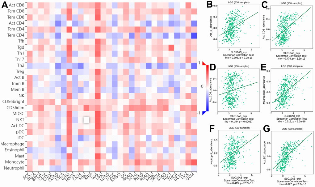 Immune correlation with SLC10A3 expression in LGGs