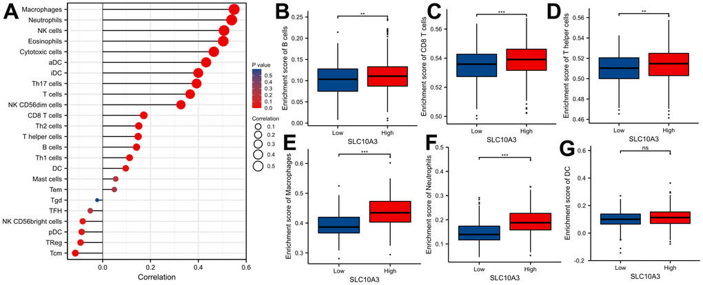 We searched the TISIDB database to further confirm the relationship between SLC10A3 expression and immune cells in LGG. Figure 5A exhibited the relationship between SLC10A3 expression and immune cells in pan-cancer, and the most close relationship was seen in LGG and GBM. The detailed correlation plots also verified the strong relationship between SLC10A3 expression and immune cells in LGGs (Figure 5B–5G). We assessed the distribution of SLC10A3 mRNA in different immune types of LGG, and statistical analysis proved that distribution of SLC10A3 mRNA was different among the four immune types (P=1.01*10-19, Supplementary Figure 3A), with C3 (inflammatory) exhibiting the highest SLC10A3 mRNA. As for the six molecular types of LGG, results of one-way ANOVA showed that distribution of SLC10A3 was significantly different among the six molecular types of LGG (P=6.84*10-26, Supplementary Figure 3B), with 1p19q codel displaying the lowest SLC10A3 expression. Finally, we employed the ssGSEA to explore the correlation of SLC10A3 with most types of immune cells in LGGs. As shown in Figure 6A, expression of SLC10A3 is strongly associated with infiltration of macrophages, followed by neutrophils, which was almost consistent with the correlation results from TIMER database. When we divided the LGG individuals into high SLC10A3 and low SLC10A3 groups, we noticed that the distributions of immune cells were almost different between high SLC10A3 and low SLC10A3 groups except for dendritic cells (Figure 6B–6G).