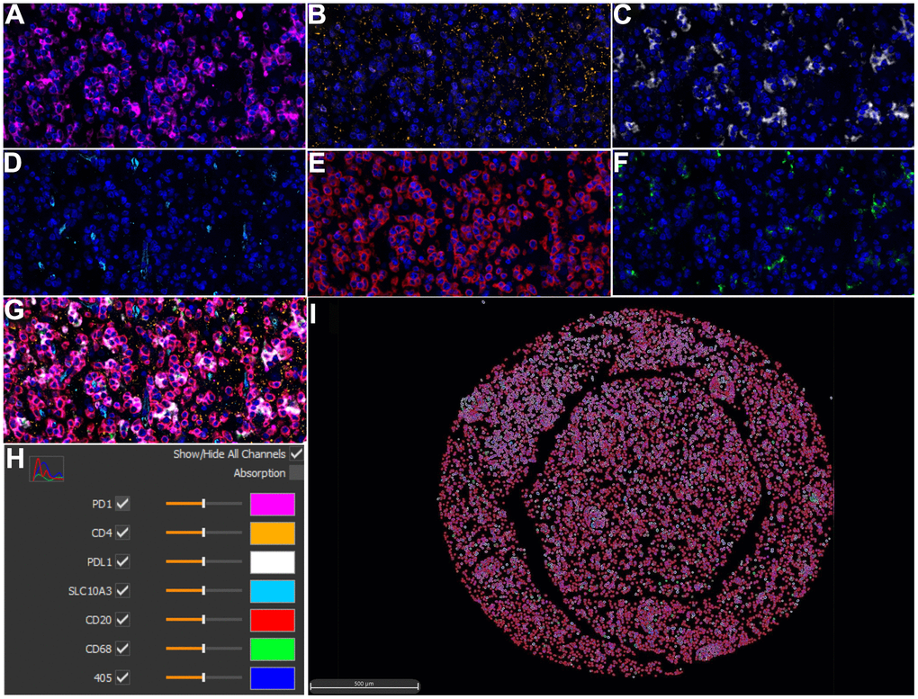 In our experiment, TSA (Tyramide Signal Amplification) technology is utilized in in immunohistochemistry. By combining AlphaTSA 7-color fluorescent staining kit with multispectral imaging analysis technology, we successfully achieved fluorescence labeling and weak signal imaging. Specifically., the LGG TMA slide was deparaffinized by dimethylbenzene, followed by ethanol with different concentration. After rinsing, the LGG TMA slide was pre-treated with citric acid solution (pH 6.0) by microwaving method for antigen retrieval. Subsequently, the LGG TMA slide was blocked in 10% BSA blocking solution, and then stained with the primary antibodies against CD20, CD4, CD68, SLC10A3, PD-1 and PD-L1 (Supplementary Table 2), respectively for 1 h at room temperature. Each second antibody binds to a different fluorophore using AlphaTSA Multiplex IHC kit (No.AXT37100031, Beijing, China). Cell nucleus were finally stained with DAPI after all the six antigens being labeled. After mounting, the LGG TMA slide was imaged for quantitative analysis via ZEN software (version 3.3).