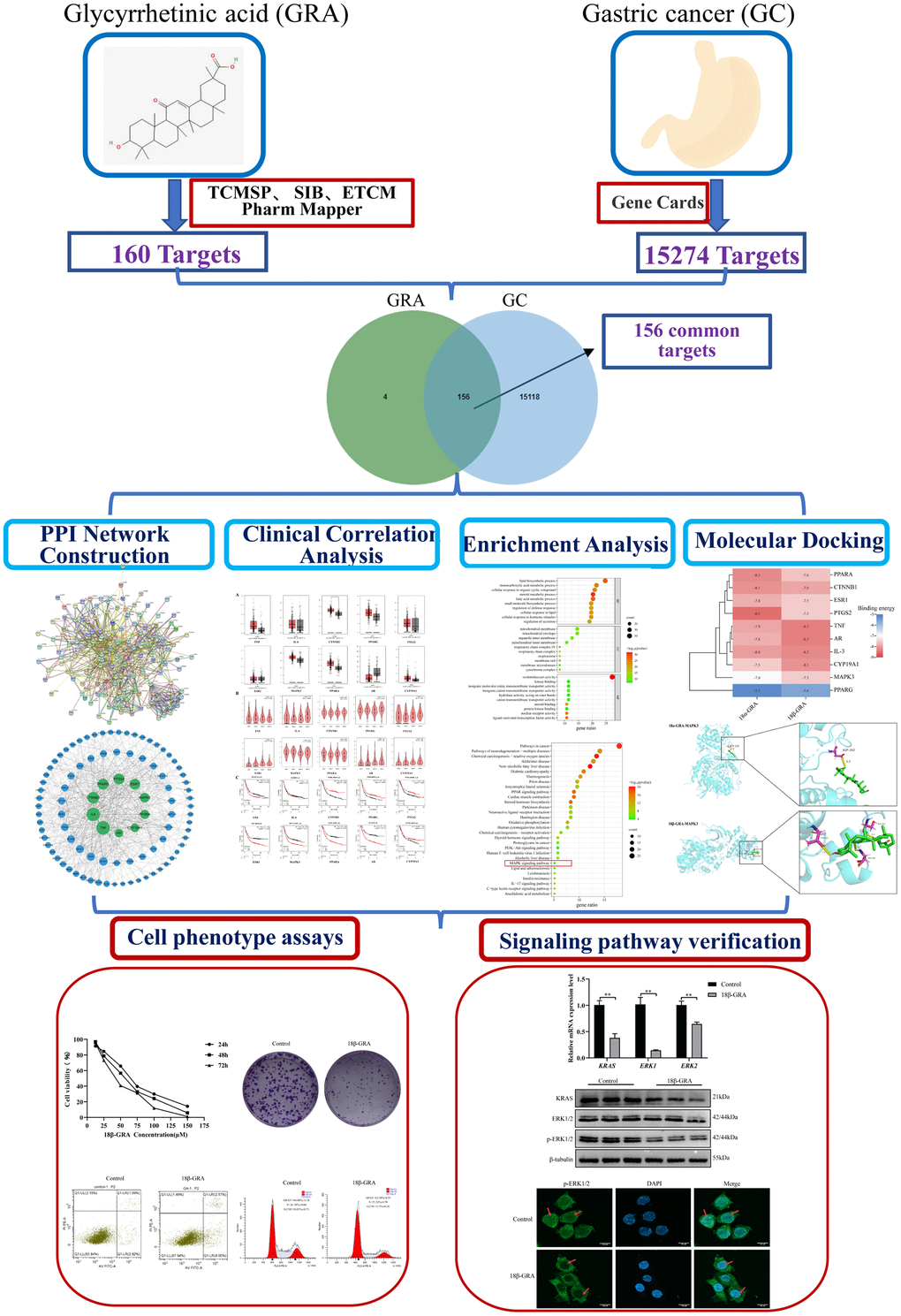 This study utilized public databases to predict the relationship between GRA and GC, and analyzed the PPI network to identify hub targets. The key target MAPK3 in the MAPK signaling pathway ranks higher in the PPI network. Further analysis showed that MAPK3 was closely related to GC staging and prognosis in clinical correlation analysis. GO functional enrichment analysis identified common targets of GRA in the treatment of GC involved transmembrane transporters and nuclear receptor proteins, and KEGG enrichment results predicted that the MAPK signaling pathway may be a potential pathway for GRA in GC therapy. In MAPK signaling pathway, KRAS is located on the cell membrane, and p-ERK1/2 can participate in signal transduction across the nuclear membrane. Furthermore, molecular docking predicted that GRA could strongly bind with MAPK3, one of the hub targets. To further verify the prediction, we conducted in vitro experiments to investigate the therapeutic potential of 18β-GRA on GC cells. The results showed that 18β-GRA could obviously inhibit GC cells proliferation, promote cell apoptosis, and arrest cell cycle.