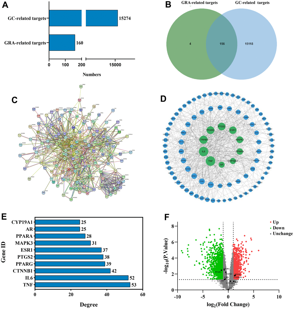 We used network pharmacology to predict GRA’s potential mechanism in the GC therapy and obtained 160 GRA and 15274 GC relevant targets with the target prediction website (Figure 3A). Afterwards, we made a Venn diagram for the GRA and GC targets, and screened 156 common targets (Figure 3B).