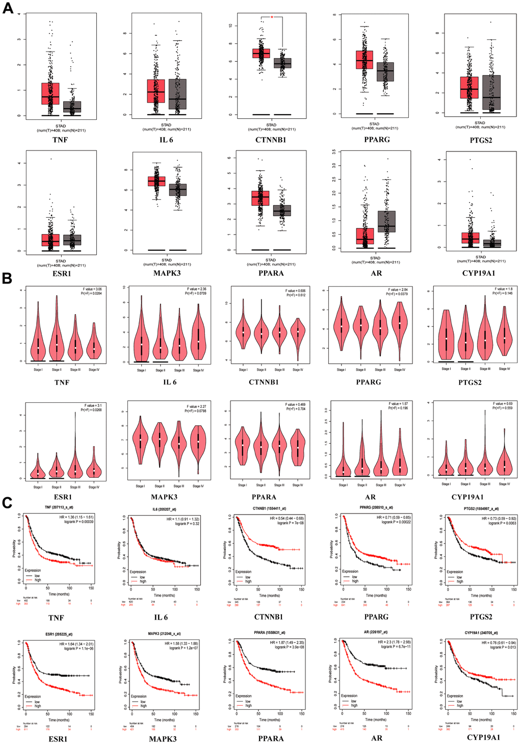 When we compared the normal group to the GC group in GEPIA, we discovered that CTNNB1 mRNA expression was upregulated (Figure 4A). TNF (p = 0.0284), PPARG (p = 0.0379) and ESR1 (p = 0.0268) were significant in tumor staging in GC patients (Figure 4B). We found that patients who had higher expression of TNF (p = 0.00039), ESR1 (p = 1.1E-06), MAPK3 (p =1.2E-07), PPARA (p = 3.9E-06) and AR(p =6.7E-11) had worse survival than patients who had lower expression, while the opposite was true for CTNNB1 (p = 7E-08), PTGS2 (p = 0.0083), PPRAG (p = 0.00022) and CYP19A1 (p = 0.013), in the Kaplan-Meier plotter database (Figure 4C). When the p < 0.001 was reached, we considered the gene to be a prognostic marker for GC (Criteria for prognostic markers were reference to The Human Protein Atlas website). Based on the p value, TNF, CTNNB1, PPARG, ESR1, MAPK3, PPARA and AR can be used as prognostic markers of GC.