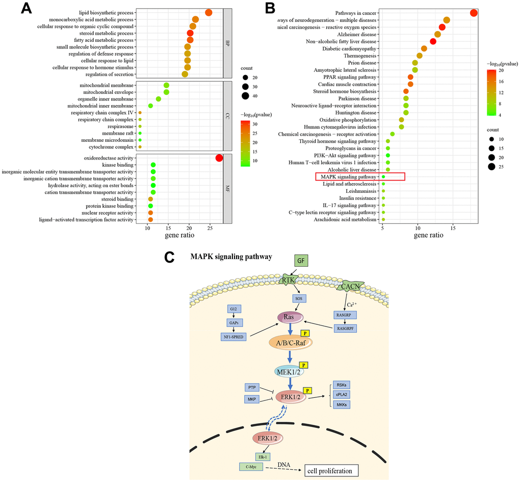 We performed it to further explore the potential mechanisms of GRA treatment of GC, The top 10 enrichment terms of biological processes (BP), cellular components (CC), and molecular function (MF) were presented in a bubble diagram (Figure 5A). The results of GO enrichment analysis suggested that common targets were mainly related to BP and metabolic process, such as lipid biosynthetic process, monocarboxylic acid metabolic process, steroid metabolic process, fatty acid metabolic process, and small molecule biosynthetic process. The MF mainly involved enzyme activity, transmembrane transporter activity, and receptor activity. Additionally, the CC were primarily associated with protein complexes and mitochondria. We also performed KEGG pathway enrichment analysis for common targets and the results showed that GRA modulates GC progression through multiple pathways associated with survival, differentiation, division and apoptosis (Figure 5B). Among them, MAPK signaling pathway is often activated in tumors, and its related proteins’ abnormal expression and tumors’ occurrence go hand in hand (Figure 5C).