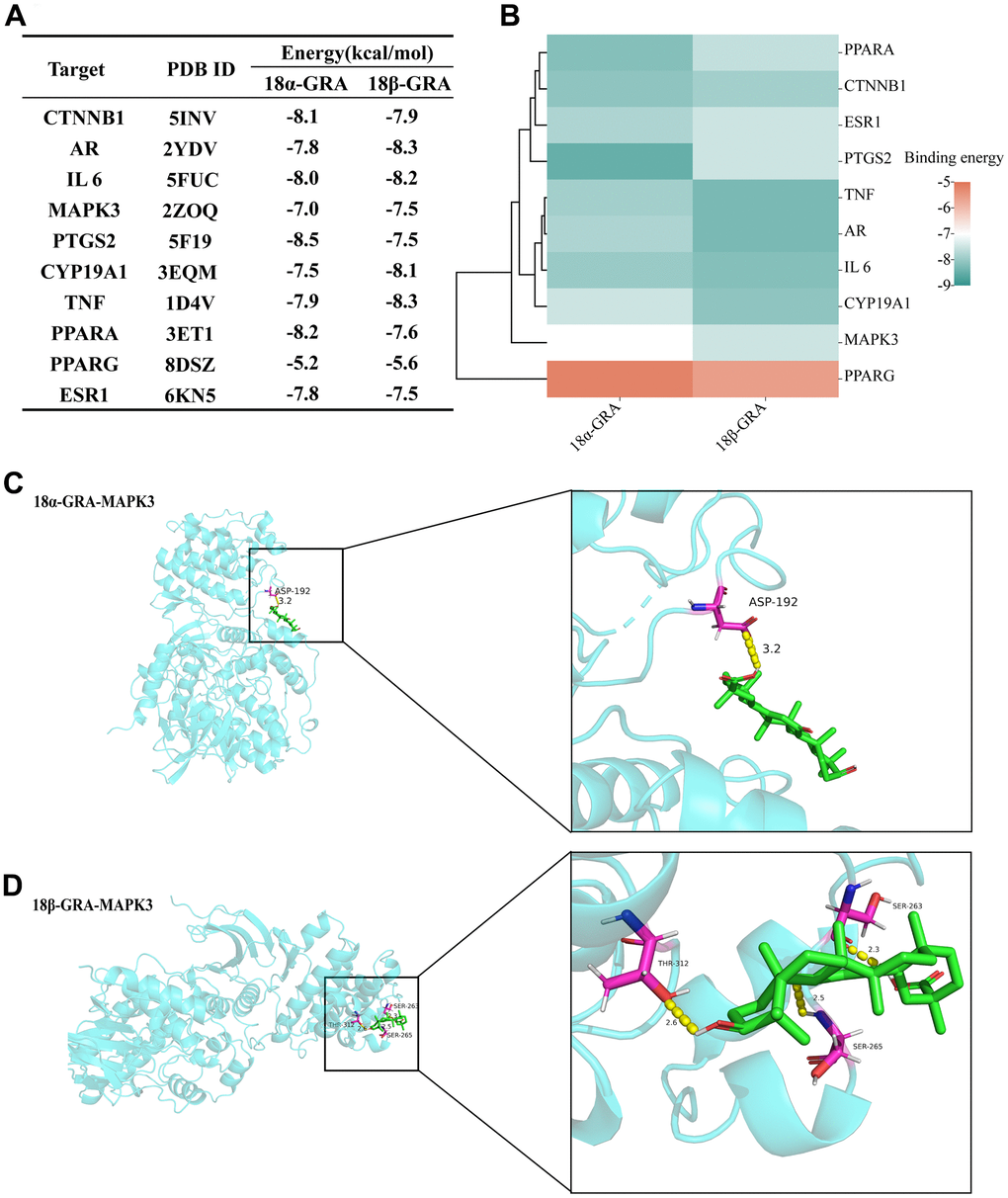Molecular docking verifies the binding energy of GRA and hub targets. The results of 18α-GRA and 18β-GRA docking with hub targets (Figure 6A). A binding energy < − 5.0 kcal/mol indicates excellent binding capability. The results showed that GRA can be combined with all the hub targets (Figure 6B). 18α-GRA and MAPK3 binding energy was -7.0 kcal/mol (Figure 6C), and 18β-GRA to MAPK3 was -7.5 kcal/mol (Figure 6D).