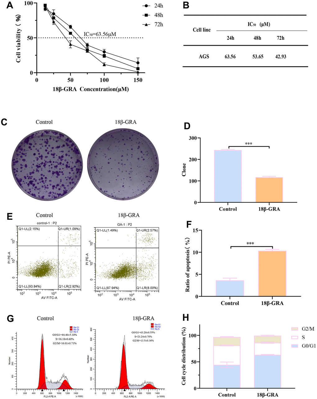 Consequently, we designed experiments to validate our prediction. 18β-GRA’s effect on AGS cells viability was demonstrated by the CCK-8 method. We treated AGS cells with different concentrations of 18β-GRA for 24 h, 48 h, and 72 h for cell viability assay. The results demonstrated that 18β-GRA could significantly decrease AGS cells viability in a dose-dependent manner (Figure 7A). The IC50 of 18β-GRA intervention on AGS cells is shown in Figure 7B. The IC50 of AGS cells treated with 18β-GRA for 24 h was 63.56 μM, so 63.56 μM intervention for 24 h was the dose administered in our subsequent experiments. As shown in Figure 7C, 7D, 18β-GRA effect on AGS cells colony formation ability was observed. The results showed that the cell colony formation ability of 18β-GRA intervention group was obviously lower (p < 0.001) compared with the control group.
