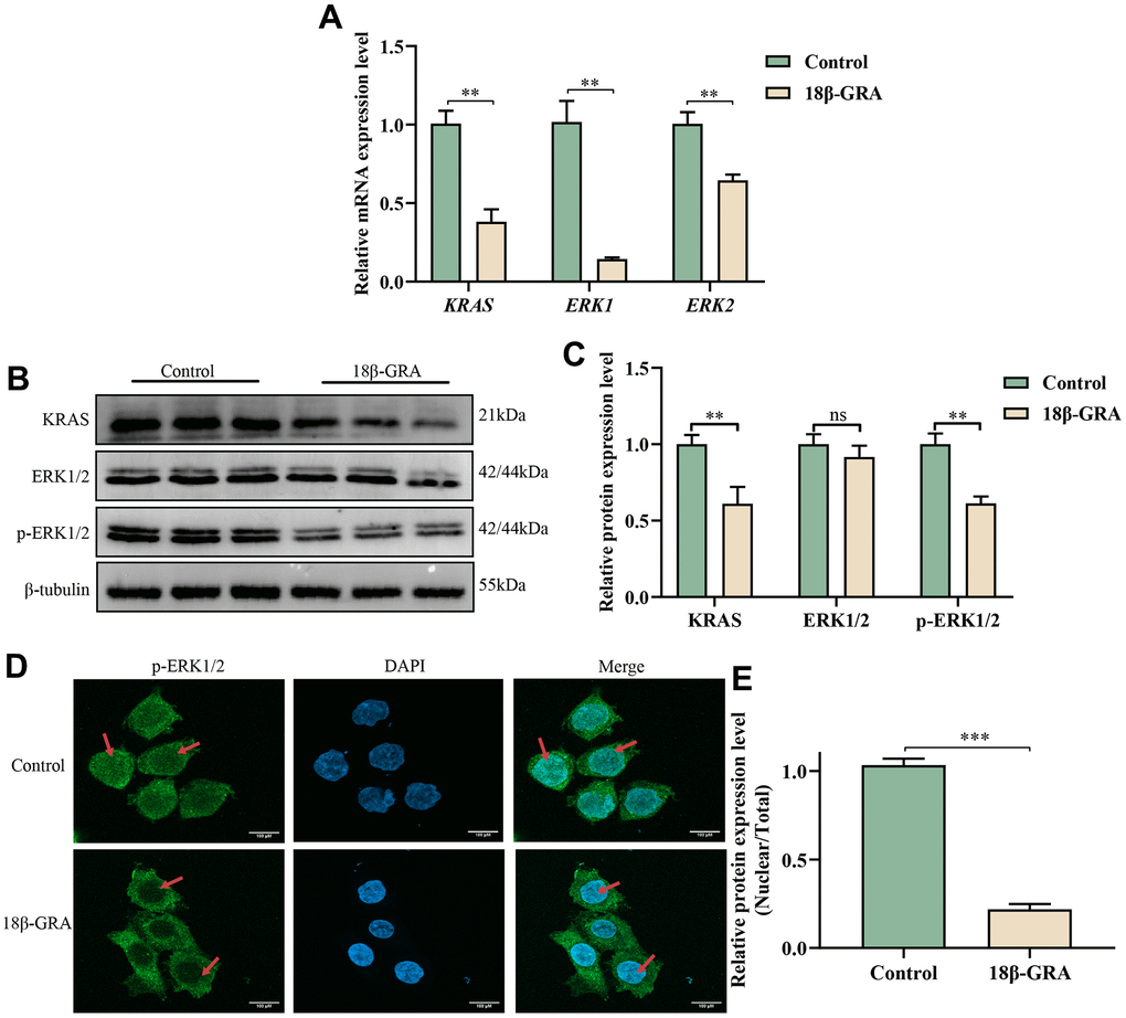 We treated AGS cells with 18β-GRA and fixated the cells with 4% paraformaldehyde. Afterwards, we used PBS to wash the cells three times, 0.5% Triton X-100 solution to treat for 15 min, and 5% BSA to seal for 1 h. After that, we used the primary antibody (p-ERK1/2, 1: 500) to incubate the cells overnight at 4° C. The next day, we used PBS to wash the cells again, added the fluorescent secondary antibody (Cat. No. 111-545-144, Jackson ImmunoResearch Inc, USA), and then incubated for 1 h. Subsequently, we stained the nucleus with DAPI for 5 min. We used confocal scanning microscopy (LSM 900, Zeiss, Germany) to take photos. All experimental groups repeated 3 samples.