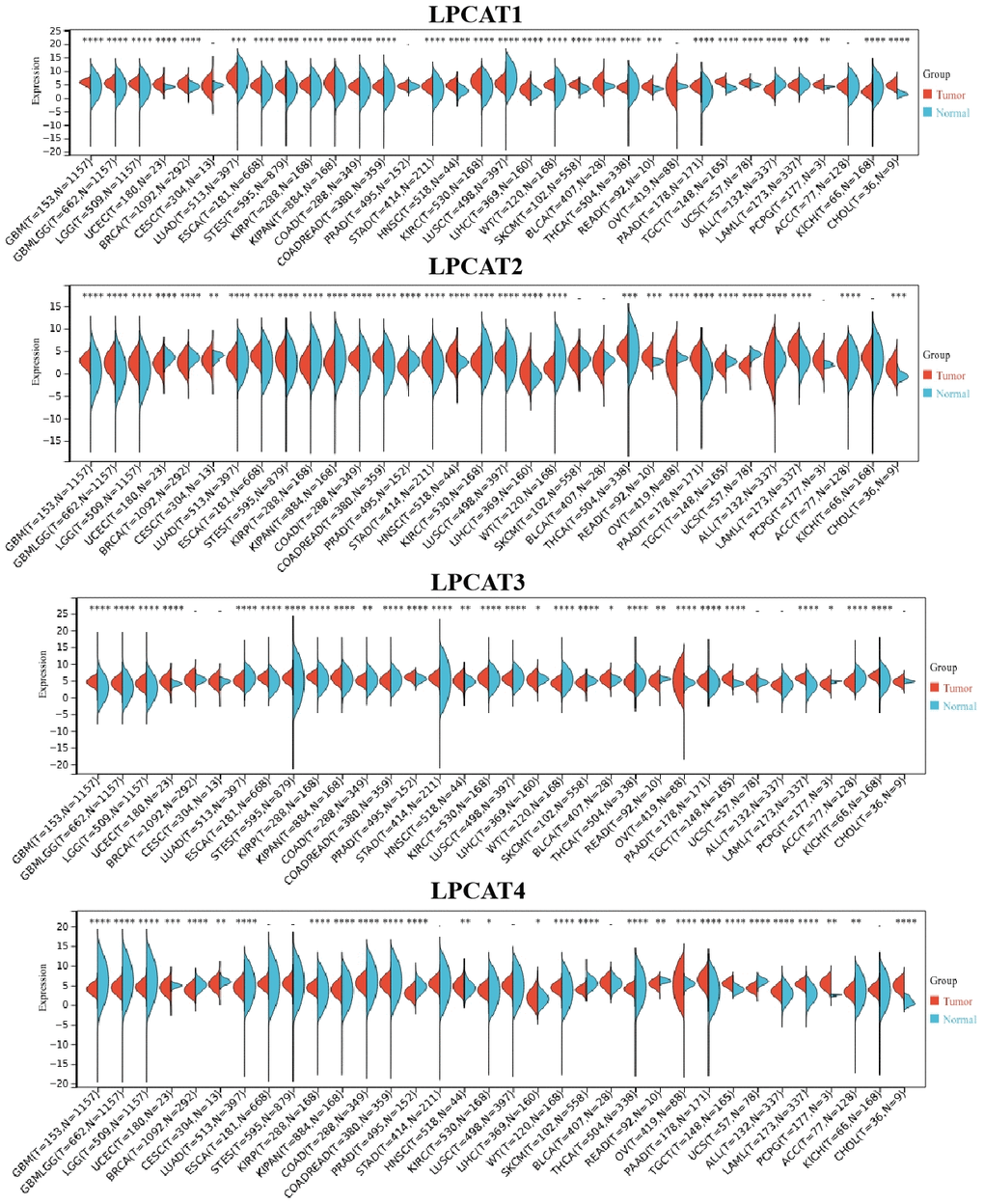We analyzed LPCATs family genes (LPCAT1-4) expression levels in pan-cancer. It was found that LPCAT1-4 expression levels were elevated in most kinds of cancer types (Figure 1).