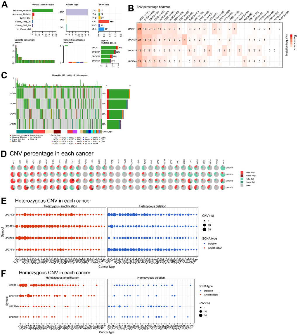 With the aid of the TCGA and GTEx datasets, we evaluated the differential expression and prognostic significance of genes belonging to the LPCATs family across 32 distinct kinds of tumors. We discovered that genes belonging to the LPCAT family were remarkably engaged in the growth of tumors and acted as risk factors for the majority of cancers. To get a deeper understanding of the possible carcinogenic mechanisms of genes belonging to the LPCATs family, we provided a detailed description of many gene alterations (including methylations, homozygous deletions, amplifications, fusions, and mutations) in LPCATs family genes. The results showed that these genetic alterations together contributed to the abnormal expression of LPCATs family genes.