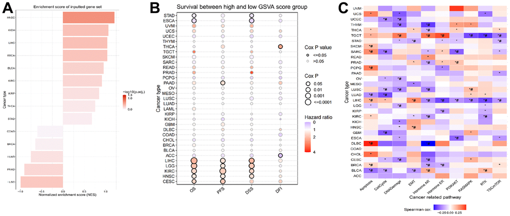 We carried out a GSVA premised on HALLMARK pathways to determine the prospective pathways that were influenced by the LPCATs score. Figure 3C illustrates the correlation between the LPCATs score and the GSVA score in cases of pan-cancer. Some key signaling pathways were found significantly associated with LPCATs score. For instance, apoptosis and cell cycle were important for the cell growth of cancer. Epithelial to mesenchymal transition (EMT) contributed to cancer cell migration and invasion. Hormone AR and ER were tightly related with endocrine therapy. PIK3/AKT signaling pathway ranked as one of the most common abnormal pathways in cancer. LPCATs score could be a useful method in predicating the abnormal pathways across pan-cancer.