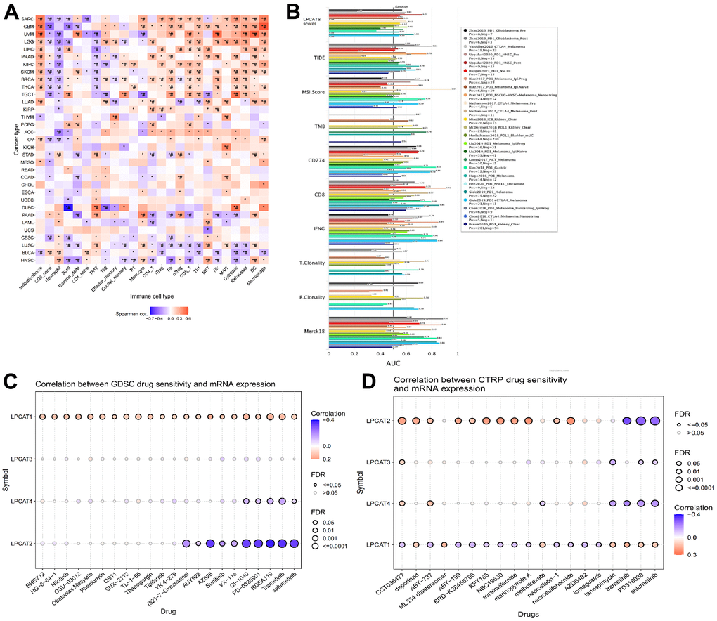 We evaluated the link between LPCATs Score and immune infiltrating score in pan-cancer. It was found that a high LPCATs Score predicated a high level of immune infiltrating in SARC, GBM, and UVM, which ranked top three in pan-cancer. Additionally, the LPCATs score had a strong link to the majority of immune cells, suggesting that the TME was immune-activated (Figure 4A).