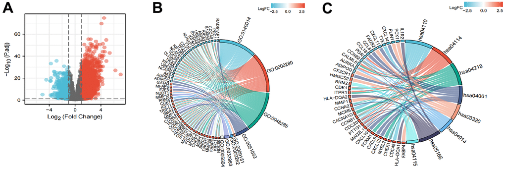 A total of 2731 genes were differentially expressed between the groups with high and low expression levels of LPCAT4 (adjusted p value <0.05, |Log2-FC| > 1, Figure 6A). We then analyzed how these DEGs were enriched in GO enrichment analysis (including biological processes, cellular compositions, and molecular functions). The results showed that DEGs were enriched in different GO terms such as mitotic nuclear division, nuclear division, regulation of DNA metabolic process, purine deoxyribonucleotide metabolic process, deoxyribonucleotide metabolic process and collagen metabolic process (Supplementary Table 2 and Figure 6B). In addition, KEGG pathway analysis showed that significantly DEGs-enriched pathways included cell cycle, oocyte meiosis, cellular senescence and PPAR signaling pathway (Supplementary Table 2 and Figure 6C).