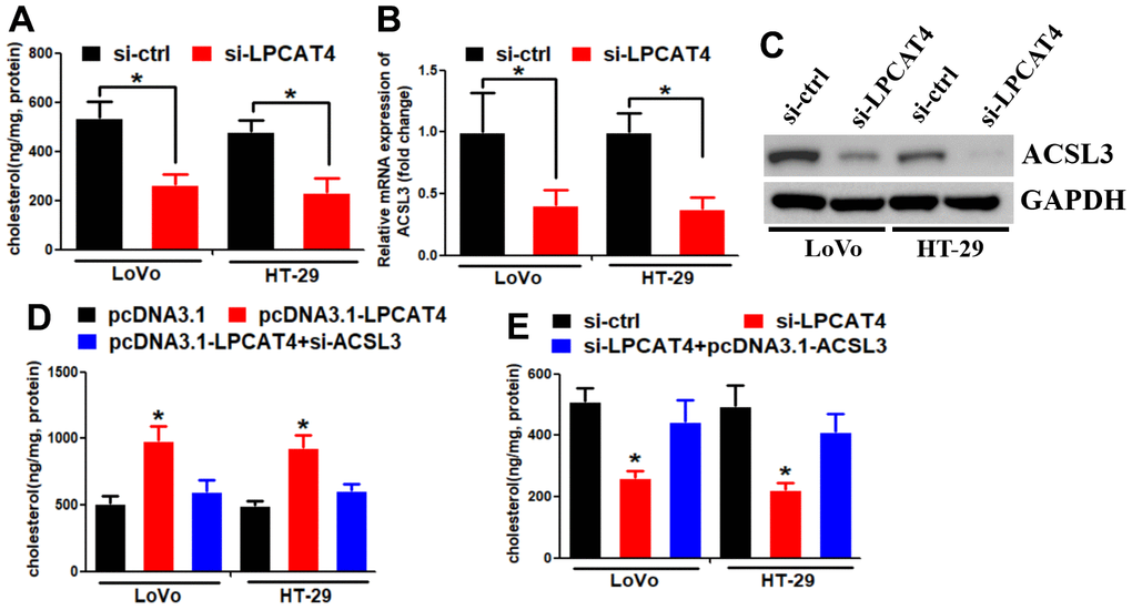 We assessed the levels of cholesterol in LIHC cells and observed a reduction in cholesterol synthesis when LPCAT4 was down-regulated (Figure 7A). A mass spectrometric analysis published in Biogrid (https://thebiogrid.org) [8] showed that ACSL3 interacted with LPCAT4. Because ACSL3 was a cholesterol biosynthesis enzyme, we thus asked whether ACSL3 mediated LPCAT4’s function on cholesterol biosynthesis. Indeed, we observed that LPCAT4 down-regulation inhibited ACSL3 mRNA and protein expression levels (Figure 7B, 7C). Overexpression of LPCAT4 increased cholesterol biosynthesis, while knockdown of ACSL3 dismissed this effect (Figure 7D). On the contrary, down-regulation of LPCAT4 decreased cholesterol biosynthesis, while overexpression of ACSL3 could counteract this effect (Figure 7E). These data implicated that ACSL3 was involved in mediating LPCAT4’s function on cholesterol metabolism.