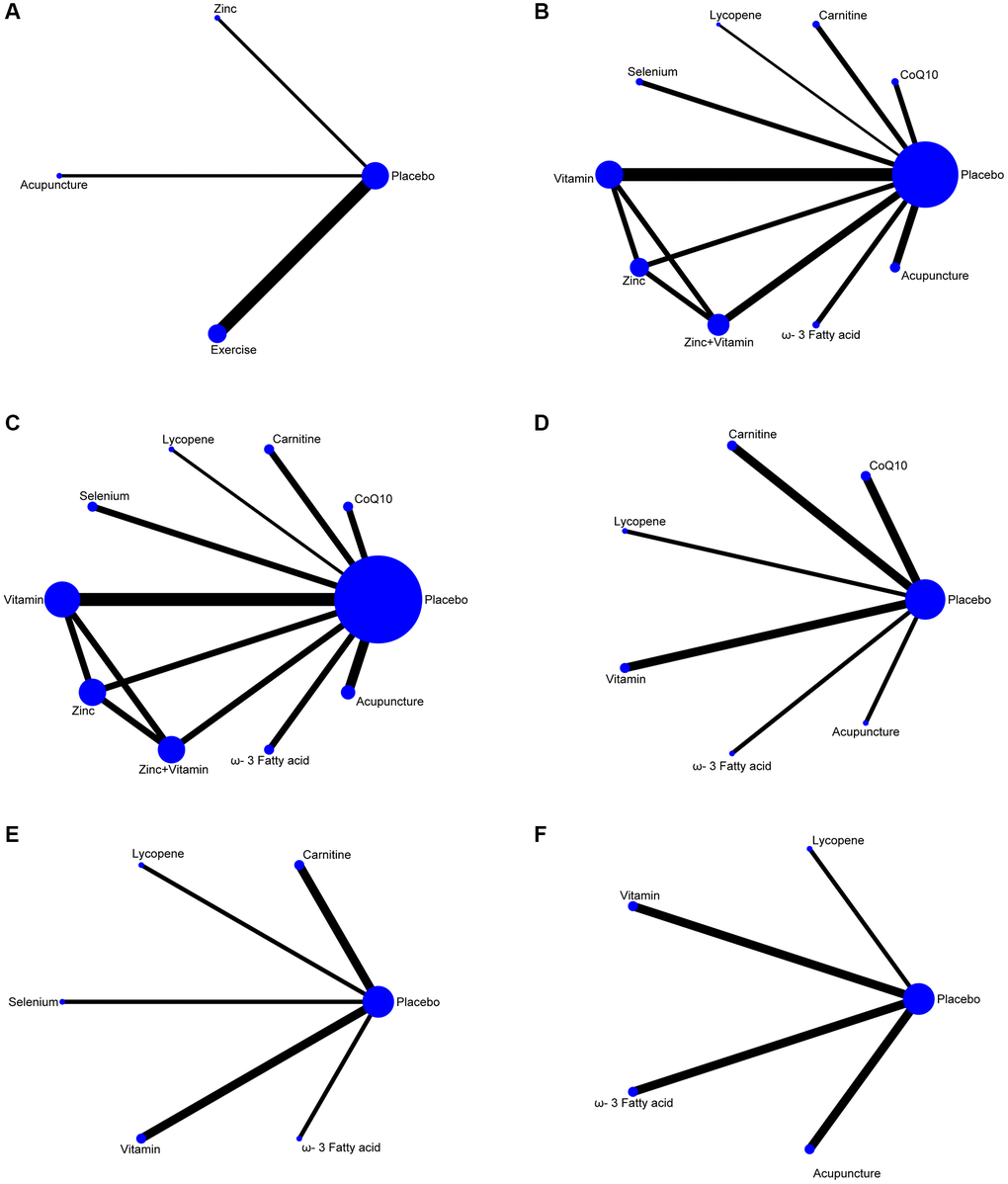 To assess the influence of non-pharmaceutical treatments on sperm quality, twenty-six studies were included. Usage of CoQ10, zinc, omega-3 fatty acids, carnitine, selenium, lycopene, vitamin, zinc + vitamin, exercise, and acupuncture are relatively frequent in these RCTs. The number of RCTs and the homogeneity between them make our network meta-analysis suitable to test the effectiveness of the various non-pharmaceutical interventions on semen parameters, such as pregnancy rate, sperm concentration, sperm total motility, sperm forward motility, sperm quality, and sperm count. The network diagrams demonstrate the correlation of all available evidence. The line thickness represents the number of included studies, and the node size indicates the sample size (Figure 2).