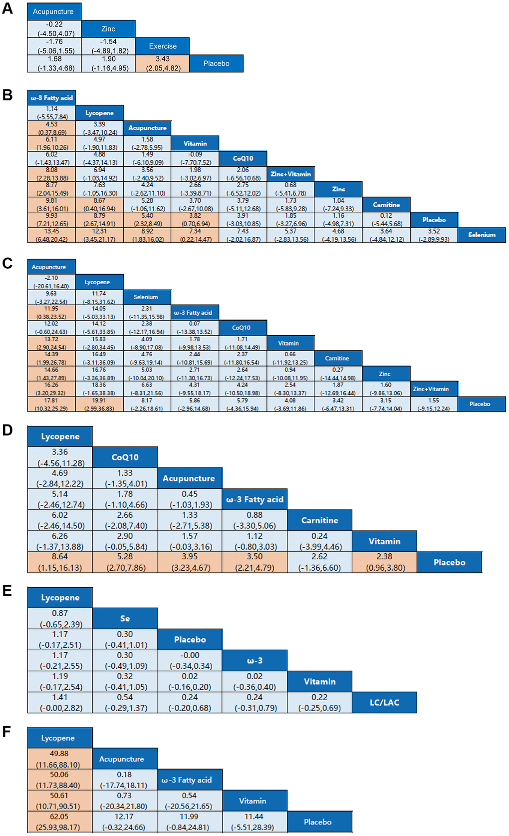 Seven resulted in the network meta-analysis for the non-pharmaceutical interventions on sperm count (Figure 2F). The number one intervention is lycopene, as indicated in the SUCRA rankings (Table 2). The results are indicated in Figure 3F. Lycopene had a better efficacy than acupuncture (MD, 49.88 (95% CI, 11.66 to 88.10)), ω-3 fatty acid (MD, 50.06 (95% CI, 11.73 to 88.40)), vitamin (MD, 50.61 (95% CI, 10.71 to 90.51)) or placebo (MD, 62.05 (95% CI, 25.93 to 98.17)). Besides, we found no detectable differences in any of the other comparisons (Figure 3F).