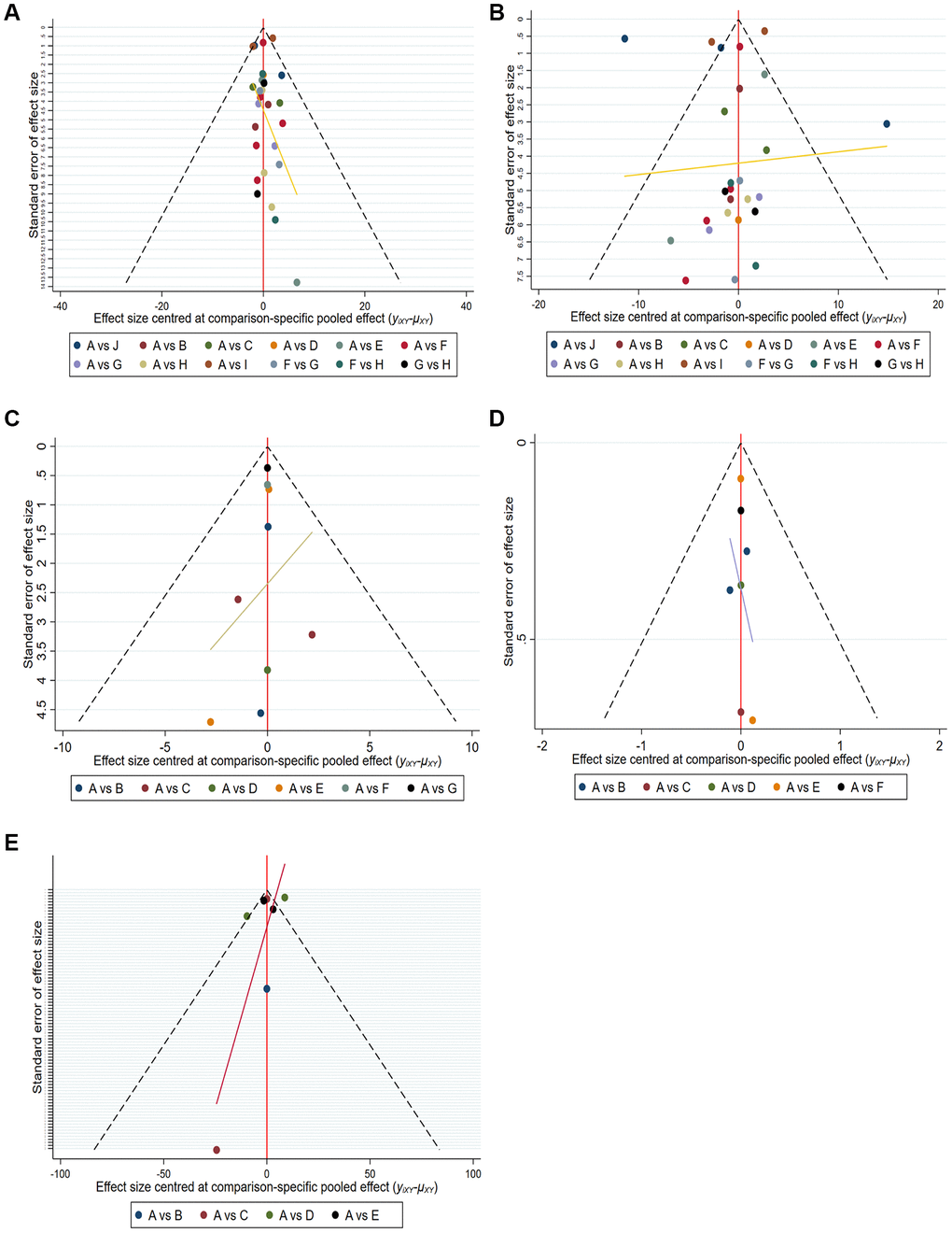 Twenty-seven articles were included in the network meta-analysis based on inclusion and exclusion criteria. Funnel plots, Begg’s test and Egger’s test were used to assess the quality and publication bias of the included studies. The funnel plot of logarithmic WMD in the included studies was symmetric, indicating no significant publication bias (Figure 4).