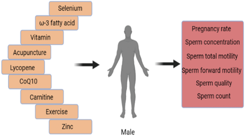 The study conducts the most extensive analysis to date of the influences of non-pharmaceutical interventions, such as acupuncture, exercise, food, supplements, and nutrients on sperm quality parameters. This study summarizes that the dietary supplementation with some antioxidants, notably selenium, zinc, omega-3 fatty acids, CoQ10, carnitine, acupuncture, exercise, and some foods rich in these supplements can profitably regulate pregnancy rate and sperm quality parameters and impact male fertility. The small number of included studies on supplements and acupuncture resulted in a small sample size for inclusion, and the high heterogeneity of the findings, meaning that further research may lead to changes in the effect estimates outlined in the meta-analysis. Therefore, more RCTs with larger samples size are needed to verify how these supplements influence sperm parameters and fertility.