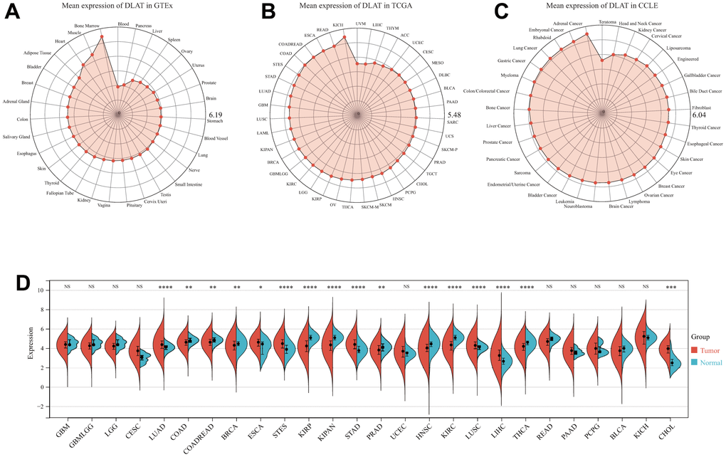 We also compared the tumor’s DLAT expression with that of normal tissues premised on TCGA data. Figure 1D demonstrates that DLAT expression was upmodulated in 7 distinct cancer types: cholangiocarcinoma (CHOL), esophageal carcinoma (ESCA), liver hepatocellular carcinoma (LIHC), lung adenocarcinoma (LUAD), lung squamous cell carcinoma (LUSC), stomach adenocarcinoma (STAD), and stomach and esophageal carcinoma (STES). Contrastingly, the expression of DLAT was shown to be low in nine different malignancies: breast invasive carcinoma (BRCA), colon adenocarcinoma (COAD), colon adenocarcinoma/rectum adenocarcinoma (COADREAD), head and neck squamous cell carcinoma (HNSC), pan-kidney cohort (KIPAN), kidney renal clear cell carcinoma (KIRC), kidney renal papillary cell carcinoma (KIRP), prostate adenocarcinoma (PRAD), and thyroid carcinoma (THCA).
